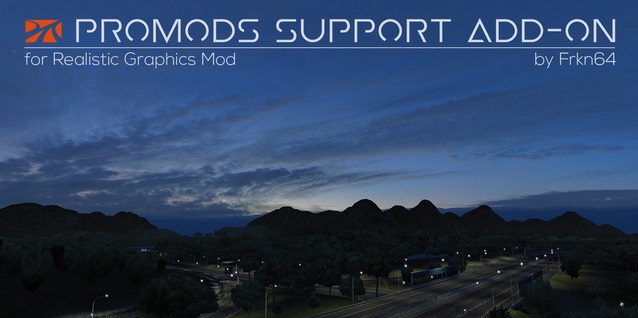 This add-on makes ProMods Map compatible with Realistic Graphics Mod. Caution !!! You need to do this order in the Mod Manager to use the mod without problems; 1-(top row) Promods Support Add-on 2- Realistic Graphics Mod 3- Promods Definition Pack 4- Promods Map Pack 5- Promods Media Pack 6- Promods Model 3 Pack 7- Promods Model 2 Pack 8- Promods Model 1 Pack 9- Promods Assets Pack UPDATE NOTES v1.9 released. Changes; – Added support for Promods v2.40 update. – Weather temperatures in Iceland has been decreased for realism.REQUIREMENTS ETS 2 – v1.34.X Realistic Credits: Frkn64 Modding |