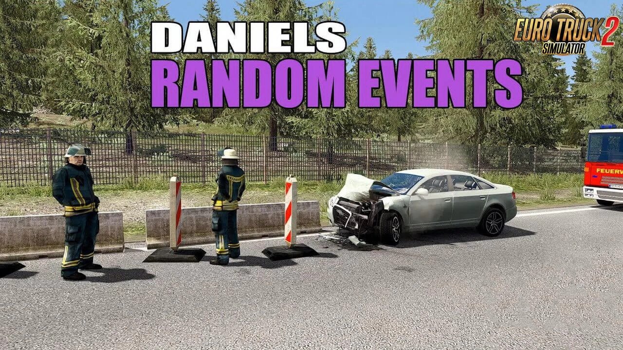 Daniels Random Events Mod - the modification adds 80 additional incidents to the roads of Europe. Some of them look really serious with overlapping several lanes. This mod adds 70 new random events (many of which have many different possible variations) to appear on the roads in ETS2. Features Daniels Random Events Mod: - These are the corrected versions created by SCS. - Various changes include: - Improved pre-warning for the player. - Improved use of cones to make events more realistic. - Improved vehicle placement to make events more realistic. - This is only the first version of this mod, and there are several ideas about other options for events Changes in v1.4.2: - Decreased chance of accident events spawning with crashed vehicles facing the wrong way. - Slightly decreased chance of accident events spawning. - Removed 'narrow' city accident events (this may only be temporary, want to see if this will increase the spawn rate of the city roadwork and channelse events). - Made 'narrow' accident events no longer able to spawn on 2 lane roads. - Removed the 'urban_area' limit on the 'city' one lane accident events (these events will now only spawn on 2 lane roads if the shoulder size is less than 1.5 this should prevent them from spawning on the main highways/motorways). List of Events: 1 Accident R1 (Plane) 2 Accident R2 (Burnt out trailer) 3 Accident R3 (Burnt out trailer 2) 4 Accident R4 (Two recovery + two cars) 5 Accident R5 (Tanker fire) 6 Accident M1 (Two Cars) 7 Accident M2 (Three Cars) 8 Accident M3 (Three Cars inc. Punto) 9 Accident M4 (Two Cars Recovery) 10 Accident M5 (Van and Small Fuel Truck) 11 Accident C1 (Burnt out car) 12 Accident C2 (Trailer spilt pipes) 13 Accident C3 (Trailer spilt crates) 14 Accident G1 (Car on side) 15 Accident G2 (Burnt out car) 16 Accident G3 (Burnt out trailer) 17 Accident Outside Lane 18 Accident Inside Lane 19 Accident + Amb Outside lane 20 Accident + Amb Inside lane 21 Accident Outside Lane (Rare) 22 Accident Inside Lane (Rare) 23 Accident + Amb Outside lane (Rare) 24 Accident + Amb Inside lane (Rare) 25 Recovery Inside Lane 26 Recovery Outside Lane 27 Recovery Inside Lane (NO CONES) 28 Recovery Outside Lane (NO CONES) 29 Recovery Hard Shoulder 30 Recovery Single Lane 31 Recovery Narrow 32 Breakdown Inside Lane 33 Breakdown Outside Lane 34 Breakdown Inside Lane (With Warning Triangle) 35 Breakdown Outside Lane (With warning Triangle) 36 Breakdown Narrow 37 City Accident (Block Lane) 38 City Accident (Block Lane) + Amb 39 City Accident Inner (Block Lane) 40 City Accident Inner (Block Lane) + Amb 41 City Accident Narrow 42 City Accident Narrow + Amb 43 City Roadwork 44 City Roadwork Inner 45 Accident Narrow 46 Accident Narrow + Amb Tested on game version 1.40.x Credits: danbywinby |