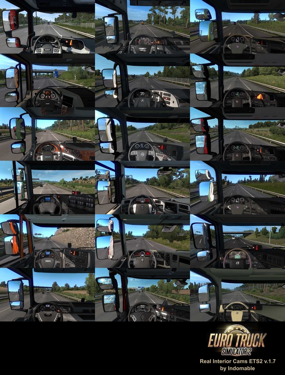 Real interior cams for all trucks v.1.7: DAF 2021 DAF XF105 DAF XF Iveco Stralis Iveco Stralis Hi-Way MAN TGX MAN TGX Euro 6 Mercedes-Benz Actros Mercedes-Benz New Actros Renault Magnum Renault Premium Renault T Scania R 2009 Scania R Scania S Scania Streamline Volvo FH Classic Volvo FH New in version 1.7: Compatible with version 1.43.3.10. New Camera for the DAF 2021. Fixed some errors. Doubts or configurations: For a better view of the cameras, use display formats in 16:9 (examples: 1920×1080, 1600×900, 1366×768, 1280×720, etc…). With the new “Adjust seats” it can modified the position the seat and the steering wheel, but they have a cap or limit, and also, does not allow adjust with detail the seat position and the steering wheel, so I have continued to update this mod with more precision, in a personal way. If it has been modified the position of the seat or steering wheel in the truck we drive, to run well the mod must be restored the seat position to its original settings, from inside the cabin click in the “F4″ key (Adjust seats) and click the “R” key to return to the default position of the seat and steering wheel. This is only necessary do it the first time and if it has been modified the seating position, if you have not already, it is not necessary. With the activated mod you can continue to modify the “Adjust seats” of the same mode as in the default game. Tested on the game version 1.43.3.10 Credits: Indomable |