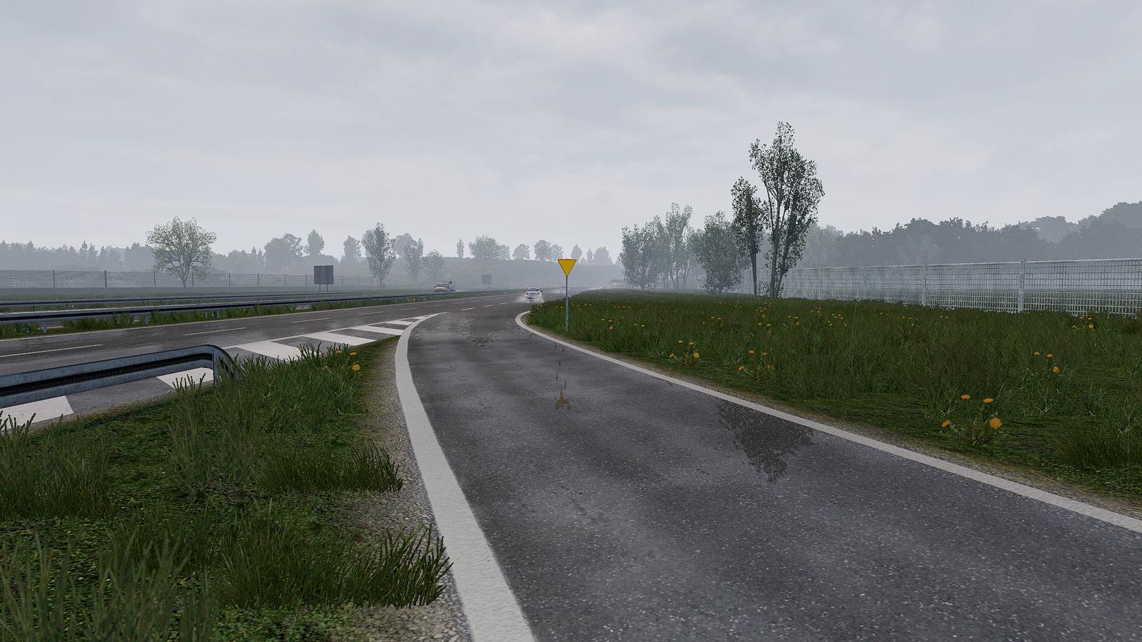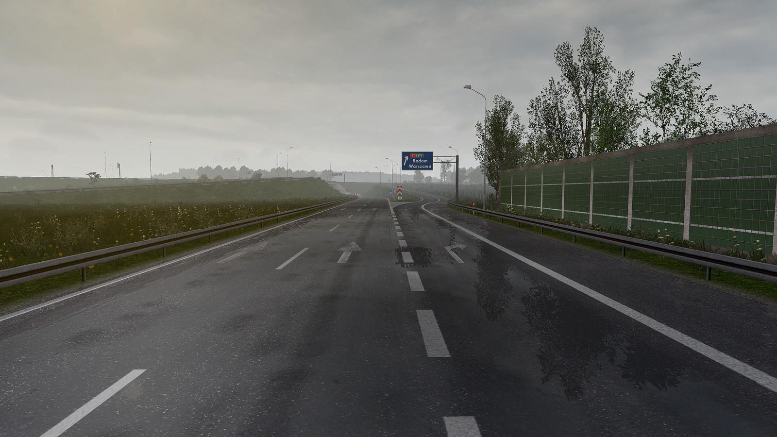 - Even more SCS, ProMods, Poland Rebuilding - files retextured (roads, prefabs, sidewalks, terrain, - grass, water, signs, lines, models and..and..and...). - New rain sound (int and ext). - New Raindrops on windshield. Credits: DamianSVW |