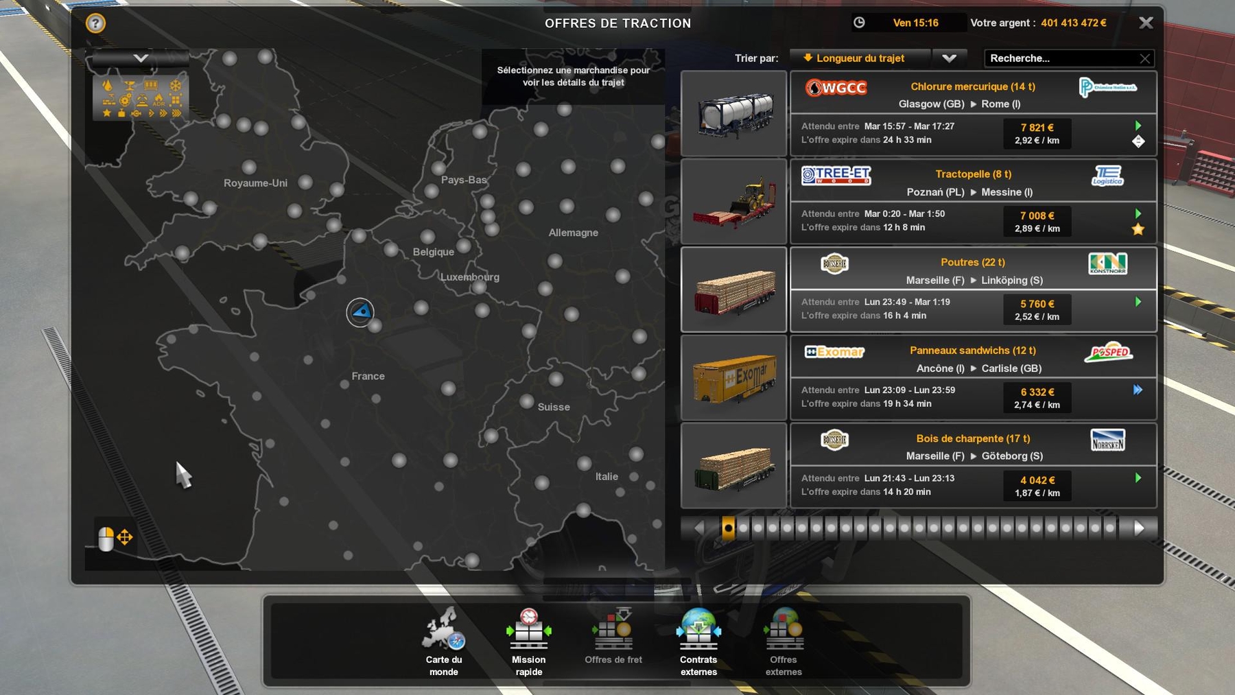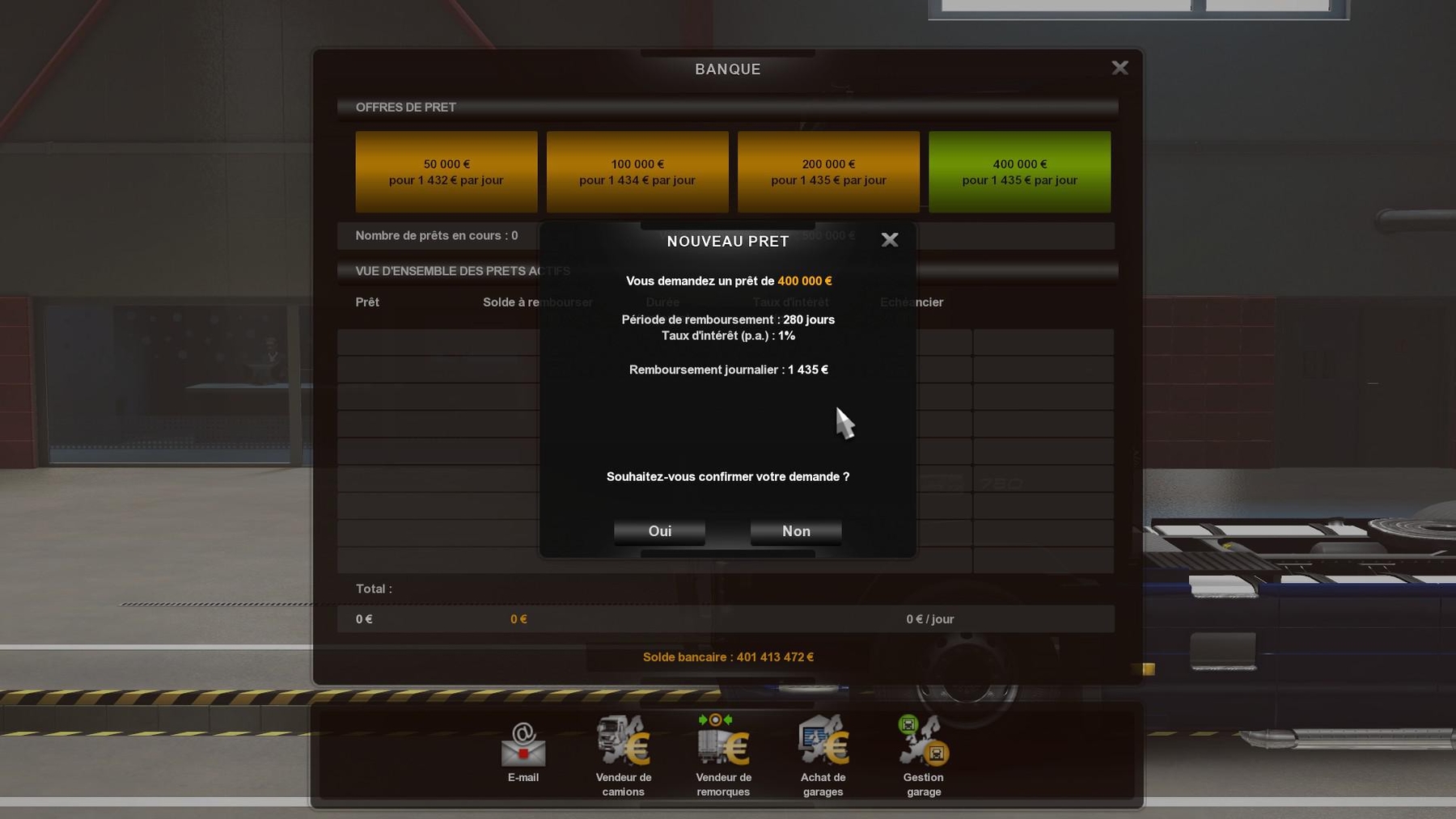 Since the version 13: Update of fuel prices. Update of exchange rates. Bugs fixed. Interest rate of the loans reduced. Cargo prices reduced. With Realism V14, you have: 1) Available on-line purchase without buying a truck. 2) Improvement of the sound of the rain and of the thunder (thanks to American-Express). 3) Fee of hiring: 1 083€. 4) Increase of the number of kilometers in the capacities of long distance. 5) Correction of data on certain engines (thanks to MichelP). 6) Starting up of the game at 6 am in the morning with 16.000€. 7) Decrease of the duration of the hurry up music to 10 minutes. 8) Decrease of the number of XP gained during a stroll (10 XP every 100 kilometers). 9) Decrease of the number of XP gained during a mission (10 XP every 100 kilometers). 10) Decrease of the number of XP gained when you drive on an undiscoevred road (20 XP every 100 kilometers). 11) Decrease of the number of XP won during a putting alongside the quay. 12) Decrease of the number of XP lost for late. 13) Decrease of the maximal loan. 14) Duration of authorized overdraft crossed in 30 days. 15) Longer durations of refund. 16) Expenses of abandonment of a trailer reduced to 1 200€. 17) Expenses of the drivers are more realistic. 18) More realistic times of rises of sun and night. 19) Modification complete of system of points of experience. 20) Modification of a part of icons (thanks to James Le Bavard). 21) Modification of the sum of the loans. 22) Modification of the parameters of the camera. 23) Opacity of the night increased to 100%. 24) Loss of XP on a trailer decreased to 1 XP by % of damages and to 1 % by % of damages. 25) Loss of the money on a trailer decreased in 10€ by % of damages and in 1 % by % of damages. 26) Possibility of making loans without any mission made. 27) Prices of accessories decreased in 90% on average so they are more realistic (even those of ALL THE DLCs excluded Flags DLC which is realistic). 28) Price of the fines fixed according to the French regulations. 29) More realistic quick cargo prices. 30) More realistic cargo prices. 31) More realistic cargo prices in traction offer. 32) Prices of the garages reduced of 30%. 33) Realistic prices of the fuel in all the countries (week 47). 34) Reduction of the consumption of the drivers in the kilometer, between 0,2 and 0,3 liters. 35) Reduction of the probability that a driver has no trailer to 0%. 36) Reduction of the maximal damages caused on a trailer by a driver to 1%. 37) Reduction of 20% of the price of the diesel oil in garages. 38) Reductions of the deadlines of delay (8 hours for the non-urgent deliveries, 4 hours for the normal and the 1 hour for the urgent against 2 days, 12 hours and 4 hours). 39) Occasions of trucks in 50% of their initial prices. 40) Interest rate of the loans reduced. 41) Exchange rate realistic (week 47). 42) Time of rest modified (11 hours of break every 9 hours of driving). 43) Reduction of the price of the refueling by the tow truck. PS: This mod contains more than 3.000 files! Ficfic & thanks to Hugo Coytte, James LeBavard, MichelP, American-Express, and Dk Credits: Ficfic & thanks to Hugo Coytte, Jam |