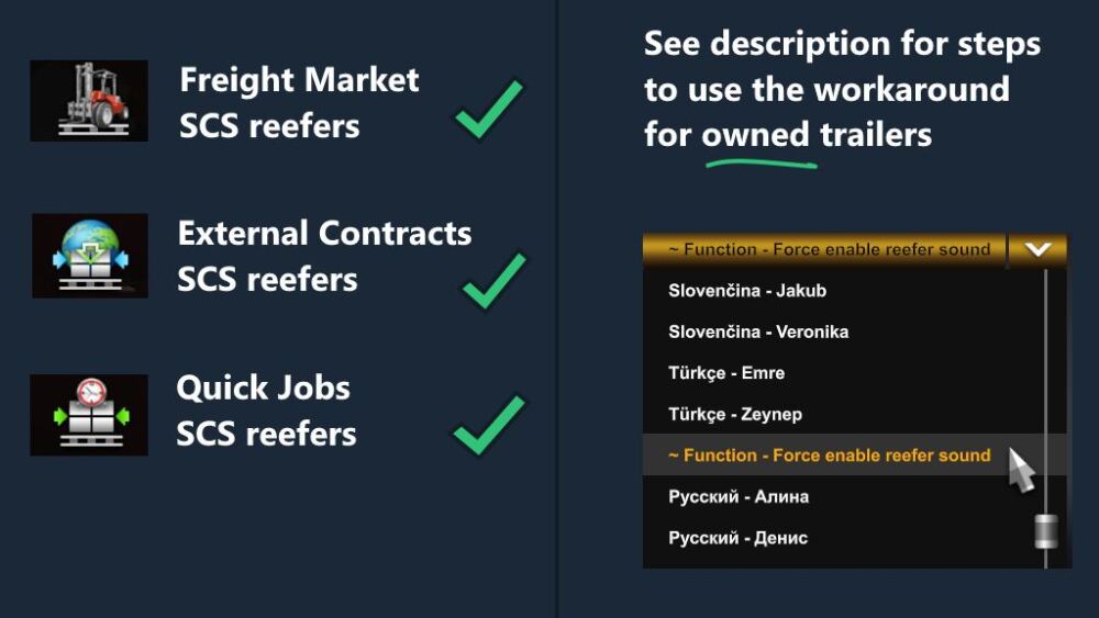 Changes: Mod description, manifest, and icon updated. Confirmed compatibility with 1.47. Hear the seamless white noise of a reefer trailer! This mod adds the definition files to activate the Sound Fixes Pack reefer sounds for reefer trailers by SCS Software. There are some trade-offs due to reefer sounds not being a standard feature in the game yet. Nevertheless, a lot of limitations have been overcome to allow more freedom and less hassles. Read below for details: Setup: 1. Enable this addon and the Sound Fixes Pack in high priority in the Mod Manager. 2. Ensure “Noise of the flowing air” is activated in the Audio settings and that there are no conflicting wind sound mods. Please note: The refrigerated trailer will beep and its engine will startup after coupling the trailer. The reefer will continue to run as you drive and you can hear the hum of it from the truck interior. The mod relies on the wind sound to carry the reefer sound. Due to the way the wind sounds are optimized, it cannot sustain the reefer sound at 0 km/h for long. The reefer sounds should kick back in once you set off, however. The sound event will stop after decoupling the trailer. If you want to take a break and keep the reefer running while idling or parked, such as when you’re parked at a truck stop: Simply disconnect and reconnect the trailer to reactivate the cycle. See compatibility section for what modes the functionality will work. For any owned reefer trailer, there is a workaround built in to the Sound Fixes Pack to enable the reefer sound as you drive. The reefer startup sound effect and the stationary reefer sound is not supported with the workaround option. Workaround for any trailer including owned reefer trailers: 1. Go into the Audio settings. 2. In the voice navigation menu, select “~ Function – Force enable reefer sound”. 3. Click the Preview button. (No sound effect expected from preview) 4. Select a different voice navigation option OR uncheck the voice navigation, then drive to hear the reefer sound. 5. If you want to turn off the reefer sound, detaching the trailer will work in most cases. Otherwise restart the game. Fully supported trailers: 1. Base game reefer trailers 2. Schwarzmüller Trailer Pack DLC reefer trailers 3. Krone Trailer Pack DLC Cool Liner trailers Compatibility: ✅ Freight Market: Confirmed to work ✅ External Contracts: Confirmed to work. ✅ Quick Jobs: Can work, but you need to disconnect and reconnect the trailer to start the cycle. ➖ Ownable Trailers: Requires the workaround – sound can play only when moving. Game versions: 1.47, 1.46 Sound Fixes Pack required for the functionality. If you want to configure the sounds to work with a different reefer trailer mod, check out the modding guide here: https://forum.scssoft.com/viewtopic.php?f=201&t=299112 Sound volume configuration: 1. The Trailer Noise slider controls the sound volume of the reefer startup noise and sound loop of a new cycle. 2. The Truck Noise slider controls the sound volume of the reefer sound loop when driving. 3. It is recommended to have both sliders at the same volume (50%) for consistency. Credits: Drive Safely Credits: Drive Safely |