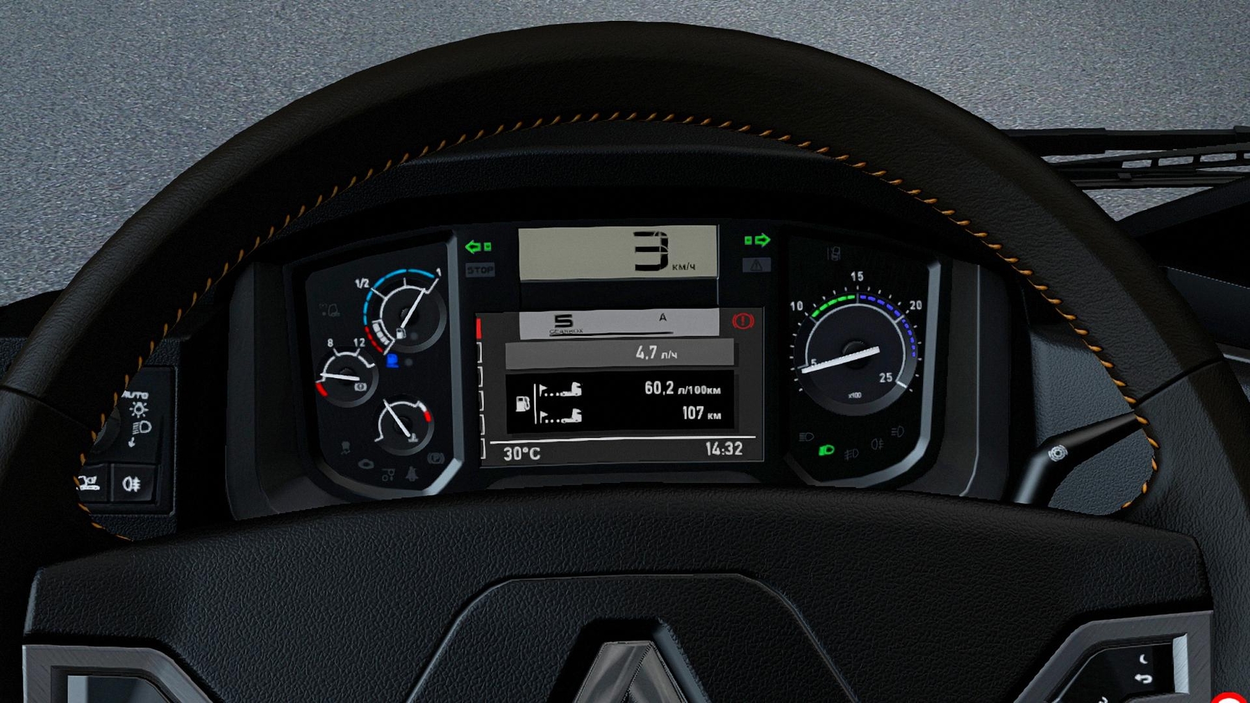 Dark interior for Renault Range T. Added a 560 HP Mack-EE 9 (from Renault Magnum AE) and a fourth wiper mode. Tested on 1.37.x version Credits: YuriI77 Credits: YuriI77 |