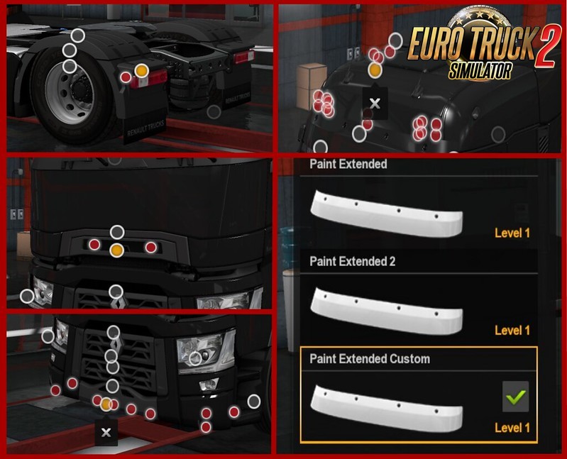 What is Light Improvement? It adds Roof Slots, Bumper Slots, Rear Fender Slots, Extended Sunshields, and diffrent Bars. Works on both cabins. And Lowered Chassis?I didnt like the vanilla height, i just like it low and this extra mod lowers them all. Its not needed just a optional mod. This contains it: - Roofslots, - Grillslots, - Bottomslots, - Rearfender Slots, - 3 Extended Sunshields, - All Chassi variants Lowered Changelog Light Improvements v1.4: Fixes: Advanced coupling got fixed Rearfenders got fixed Sepperated Chassis Remade materials of all painted parts from my mod. New in v1.4: Renault Aero Parts (Front/Sideskirts 4×2 only) Dirt deflectors (Side Deflector slot) Window deflectors (Sidemirror slot) Sunshields standard extended black White Roofmarkers Custom Sideskirts 4×2 6×2/4 6×24 (Sidepipe or non pipe) 4×2 Square sidebar whit orange lights New custom sunshield 2 Lightboxes as accessory French & German plate Removeable sidereflector Painted lights xenon/halogen (Thanks to umri20) Painted Rearfenders/Covers all varaints added (Thanks to Sogard3) Staircase slot for front fenders also in paint (Thanks again to Sogard3) Added curtain in exterior view Templates added for custom parts/String lines for paintjob system included. This addons i used: (***Set the mod higher then 50keda's mod, i had to edit his hookup for the Rearfender Sidemarkers!***) This addons i used, i preefer you them: (Set the mod higher then all your accessory mods, i had to edit the hookup for new suitable strings! The shown accessorys below are supported! abasstreppas Hella Auxiliary light pack 1.0 Hella Double Burners by abasstreppas [powerkasi] Light & Accessory ETS 2 PACK MUDFLAPS Boreman LED Marker Lights v1.7 Legendary "50k-addons" Credits: Gloover, Sogard3, umri20 |