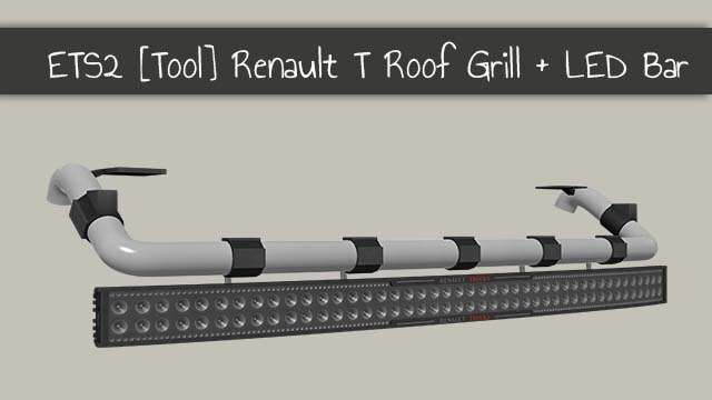Name: ETS2 [Tool] Renault T Roof Grill + LED Bar Game: Euro Truck Simulator 2 Game Version: 1.41.* or above Author: SASq Info about Roof Grill: The grill using the truck color and support up to 32(16 per side) slots for A or B cabin versions. For proper attaching the LED Bar just use the attaching spot in the middle and little under the grill. Info about Led Bar: The LED Bar can be attach/detach to the grill. Supported lights are Turn Signals, Low and High beams. KNOW ISSUE: The LED Bar is showing like attaching option for all available roof grills. If you want to support me: https://www.paypal.com/paypalme/SASqDonate Credits: SASq |