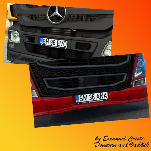 I used the basic mod of ” License Plate By Donovan è Vad&k ” to create this pack of Romanian license plates for trucks. The mod works in the following trucks: 1. DAF XF 105 by Vadik 2. Volvo FH&FH16 2009 by Schumi 3. Mercedes Actros MP4 by Schumi 4. Mercedes Actros MP3 bySchumi 5. DAF XF 106 by Schumi 6. Volvo FH&FH16 2012 by Schumi 7. MAN TGX Euro 6 by MADster 8.MAN TGX by MADster 9. Volvo FH&FH16 2012 by Eugane 10. Renault Magnum by Knox_xss 11. Scania R NexGen by Eugane 12. Scania S NexGen by Eugane 13. MAN TGX Euro 6 by SCS 14. VOLVO F88 by XBS – Included are the following provincial plates of: Alba, Arad, Argeș, Bacău, Bihor, Bistrița-Năsăud, Botoșani, Brașov, București, Buzău, Caraș-Severin, Călărași, Cluj, Constanța, Covasna, Dâmbovița, Dolj, Galați, Giurgiu, Gorj, Harghita, Hunedoara, Ialomița, Iași, Ilfov, Maramureș, Mehedinți, Mureș, Neamț, Olt, Prahova, Satu Mare, Sălaj, Sibiu, Suceava, Teleorman, Timiș, Tulcea, Vaslui, Vâlcea and Vrancea The purpose of creating this mod is to bring realism and fun to ETS2 players! -For more information you can contact me via my social networks Credits: Authors: Emanuel Cristi, Donovan and Vad&k Credits: Emanuel Cristi, Donovan and Vad&k |