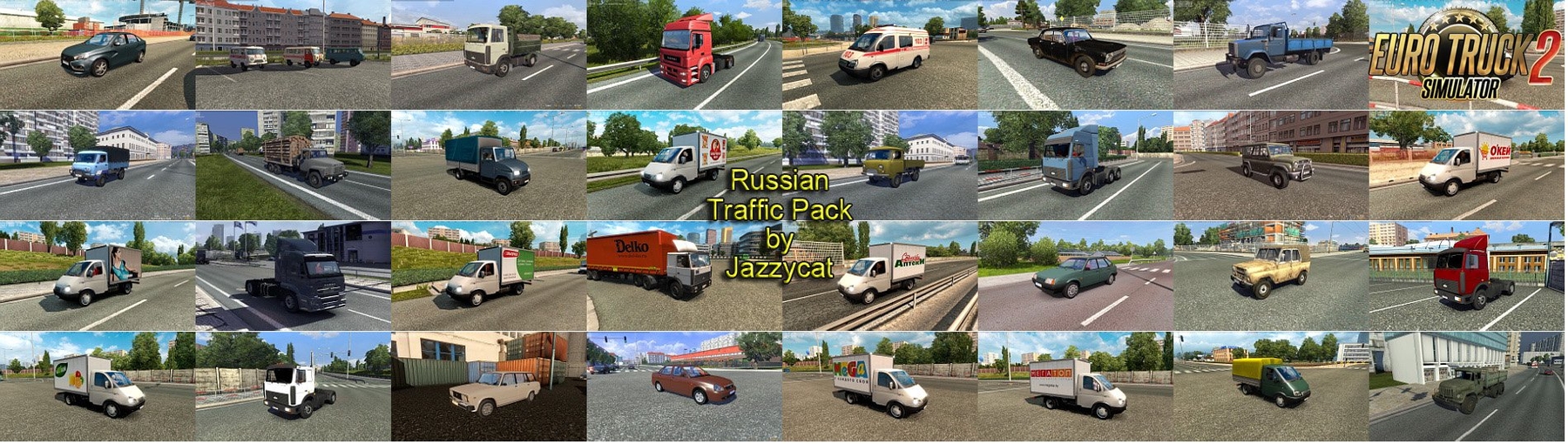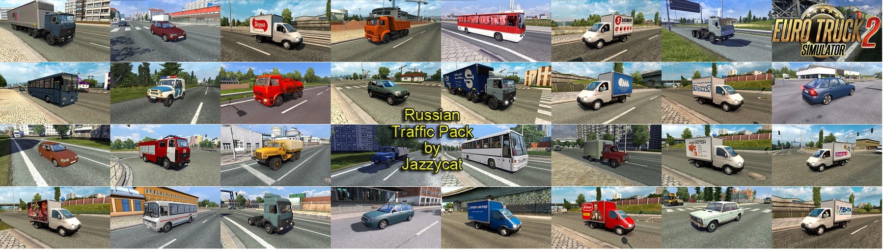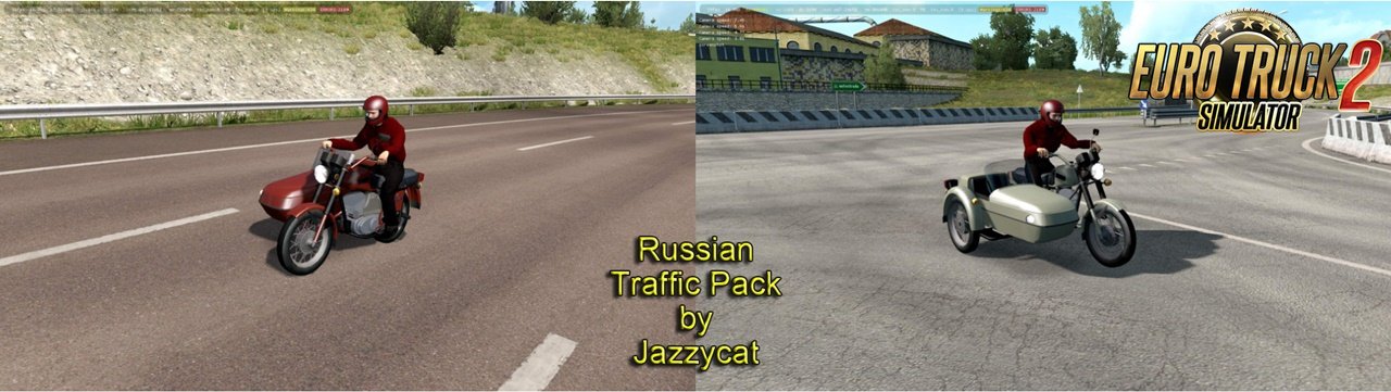 New version 2.5: - added motorcycle with sidecar Izh Planeta 5, - added new countries from Promods Middle-East Add-on. This pack adds in traffic 96 russian vehicles. All standalone. For game version 1.35.x Compatible with all Jazzycat packs. Included versions for Russian maps (Russian vehicles only on Russian maps) and all other maps (Russian vehicles everywhere). You must have in mod folder two files Credits: JC |