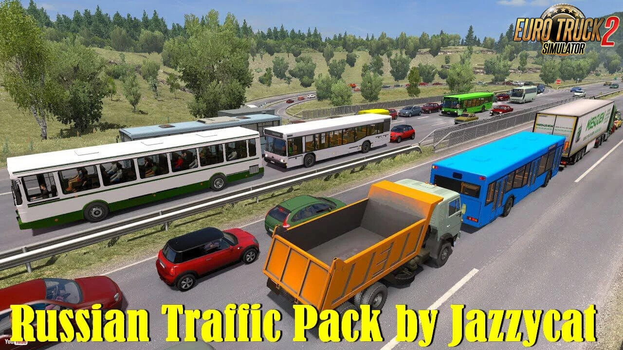 Russian Traffic Pack - An ideal set for russian cars. Pack Russian traffic adds almost a hundred domestic cars, buses and trucks to the road of the game Euro Truck Simulator 2. The mod works on all maps, according to other models from the Jazzycat, it is standalone and nothing replaces. Features mod Russian Traffic Pack: - In total, 103 Russian passenger cars, trucks, tractors and buses are added; - Everything is spelled out separately, does not replace anything; - Works on any cards; - Compatible with all Jazzycat packs; - Includes two versions: for Russian cards (Russian cars are allowed only on Russian cards) and for all other cards (everything is allowed everywhere); Changes in v3.3.1: - remaked and optimized definitions for vehicles, improved country definitions, reduced spawn frequency for some cars and trucks. You must have in mod folder two files: russian_traffic_pack_by_Jazzycat_v3.3.1_base.scs and russian_traffic_pack_by_Jazzycat_v3.3.1_def_for_non-russian_maps.scs or russian_traffic_pack_by_Jazzycat_v3.3.1_def_for_russian_maps.scs Credits: JC |