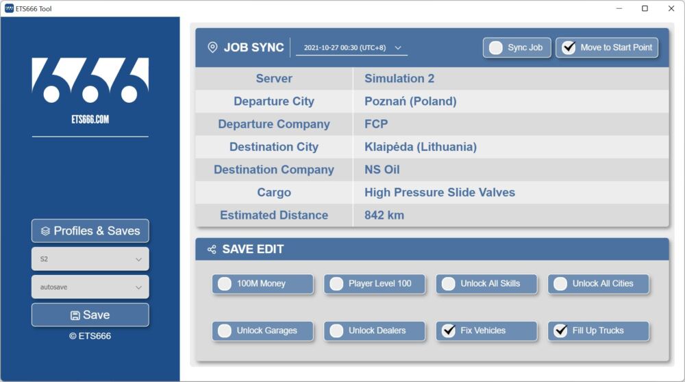 A tool to edit saved files and synchronize jobs in Euro Truck Simulator 2. It is easy to use. All features are provided as ticks. Random routes are generated every 2 hours and switch between Simulation 1 and ProMods at 4am (UTC) every day. Everyone is welcome to join our random trains in Multiplayer! Important This program is still in alpha state and MAY BURN YOUR SAVED FILES. A backup file (game_bak.sii) will be created in the save file directory before saving. If you encounter any problems, please post a reply or create an issue on github. Features Edit money Edit player level Unlock all player skills Unlock all cities Unlock and upgrade all garages Unlock all truck dealers Repair all vehicles and trailers Fill up all vehicles Choose a listed job to synchronize Teleport truck to starting point Compatibility 1.47 OS Windows 10 x64 please donate: https://www.paypal.com/donate/?hosted_button_id=MB39A8JBM4ZGN Credits: xiaosi, Mingran7, GiGiKing, Sniper, sunwinbus Credits: xiaosi, Mingran7, GiGiKing, Sniper |