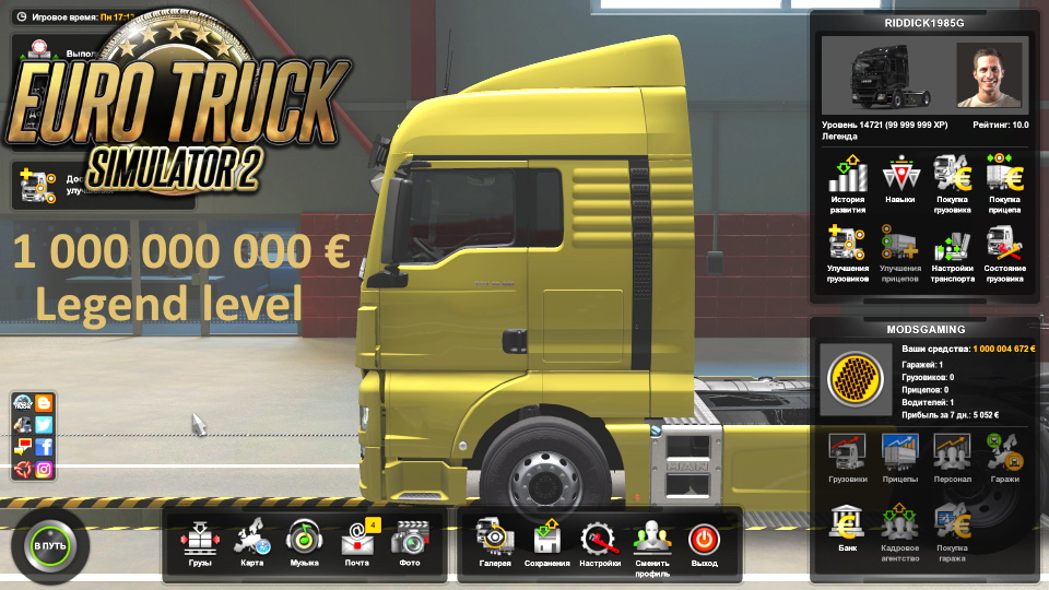 Mod SaveGame for Euro Truck Simulator 2 Clean save without mods and DLC Account 1,000,000,000 Level 14721 (Legend) Skills are all available Map researched 1% Test on version 1.39.1.0s Credits: MODSGAMING |