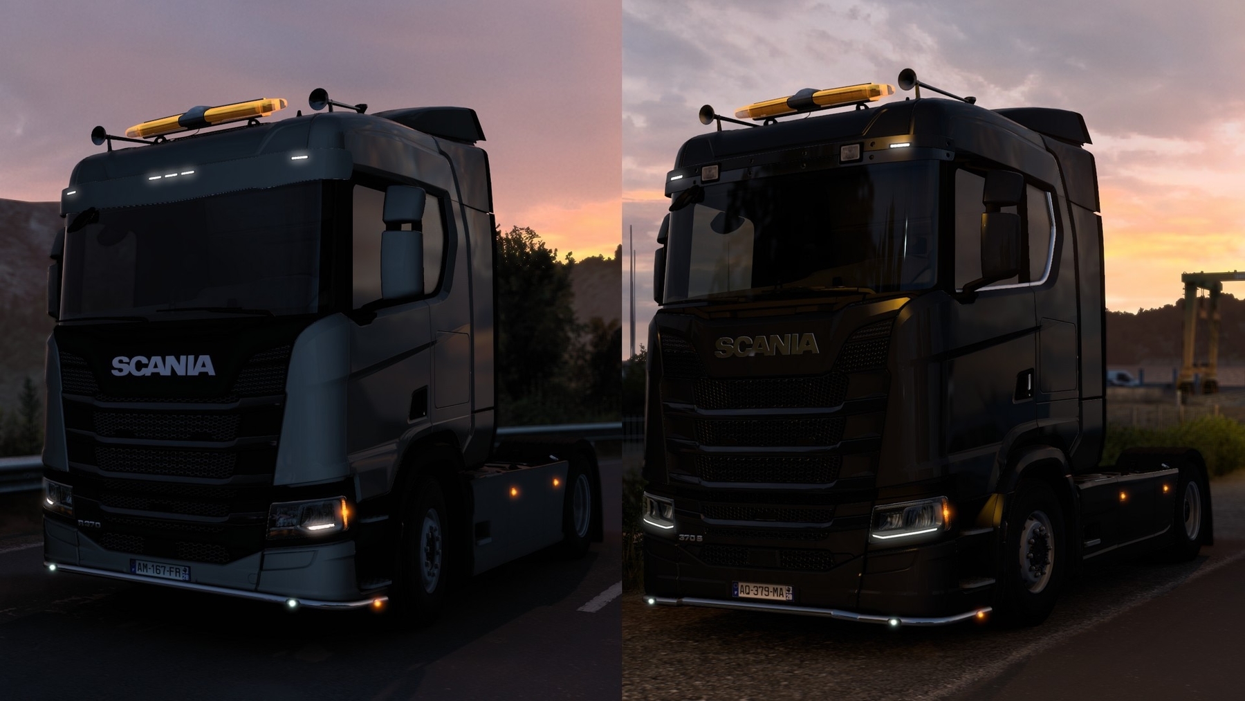 v1.1: Updated for 1.43 This mod replaces Scania 2016 DRLs with front position lights with increased brightness, to compensate for the loss of DRLs. It affects both 'Stock' and 'Exclusive' headlamps as well as Paint, Paint Luxury and Ranger sunshields. Credits: Remi |