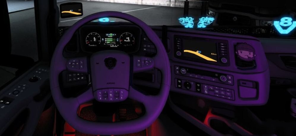 SCANIA 2016 Next Gen interior Color options: White blue White black White red White green Execution: all Scania 2016 variants (R/S, Low/High), EU & UK Additive: 5 steering wheels (white> blue, white> wood, white> black, white> red, white> green) can be selected in any configuration from the truck configurator !! Multiplayer: It is not possible Only in use with the official DLC “Mighty Griffin Tuning Pack” works .. Version 1.41 Have a good trip Credits: Pedro |