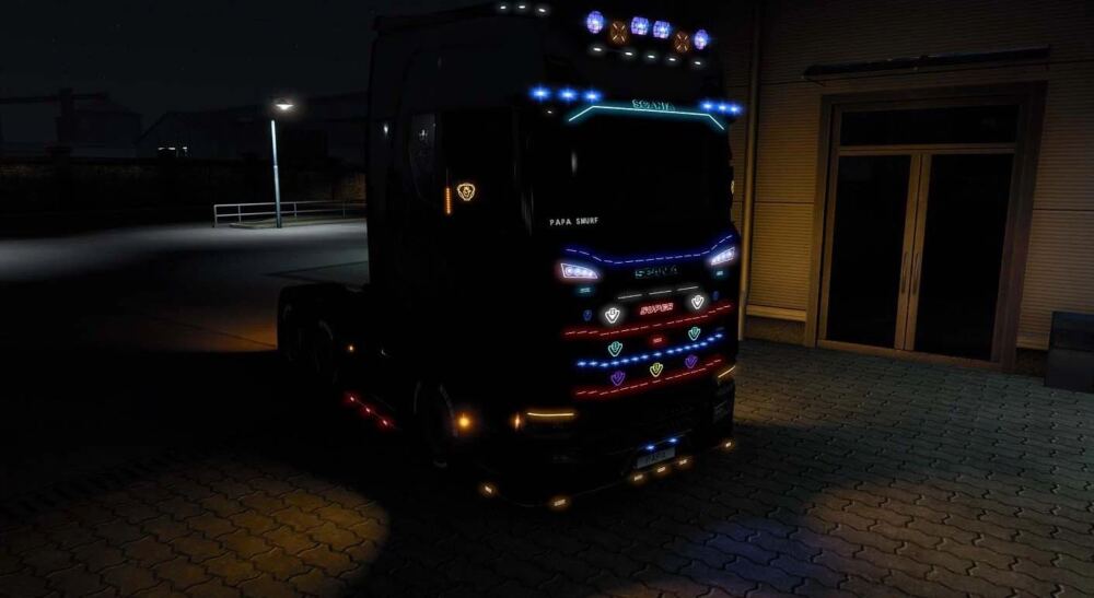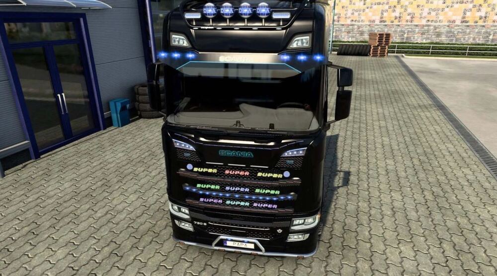 Changelog -Spot halogen lights updated! -Small lamps updated!!! -Painted mirrors with sequential blinkers added (green, red, blue, purple, yellow and orange glowing logo). -Sunshield in 5 options added!!! All halogen spot lights are remaked!!! This mod contain: -Halogens Ledson -Hella -DLA -Super logo -Small led lights for all trucks (no reflection) -small lights with reflection for all trucks -roof grills for Scania S 2016 -bottom grills for Scania S 2016 -Sunshields for Scania S2016 -Letter plate with all alphabet for: Daf XF 105, Daf XF Euro 6, Volvo FH16 2012, Scania S 2016. -One roof grill is with lightbox (Scania S).You will also find police small strobo lights. Blue strobo lights. Red strobo lights. Red low beam small light. -Standard mirrors with turn signals. -Painted mirrors with sequential blinkers in 5 different options, Badges addons – super and v8 all glowing in 5 colors. -Wheels and Gryfin skin are from different mods Credits: Papa Smurf Credits: Papa Smurf |