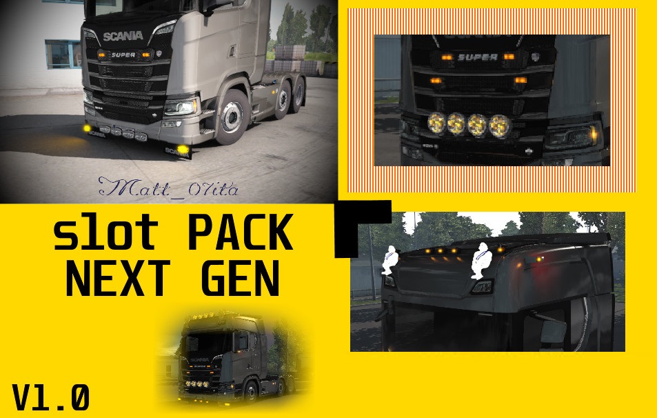 Hello guys! To make things easier for you I have created a package that groups all recent mods for NEXT GEN. These will not be only the mods but in a while some other mods related to the Scania NG will come out in this package: – BOTTOM SLOT -FRONT SLOT -ROOF SLOT V1.5 With this pack will come out a fantastic scania holland style RECOMMENDED MOD: -JETTA addon -50K -HELLA PACK -COMPATIBLE EUGENE SCANIA Credits: Matt_07ita |