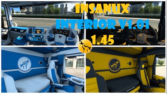 Features – Blue/White Scania Interior – Yellow/Black Scania Interior – Steering Wheels – UK Changelog v1.01 – Update for 1.45x Credits: Insanux Credits: InsaneCallum |