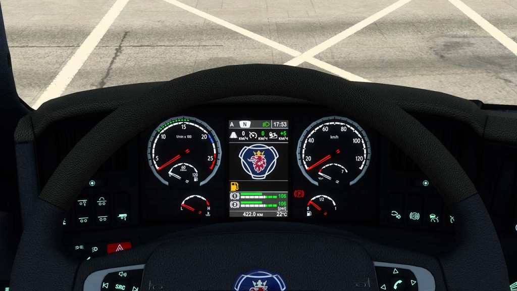 This mod improves Scania R 2009 and Streamline dashboard: – based on “Scania R and Streamline Realistic Dashboard Computer” from Oscar – changed font to default – added low beam icon – added engine brake icon – added current speed value indicator – added guessed operating range of vehicle indicator – added fuel bar – added the remaining fuel in the tank as a percentage – added ETA (estimated time to arrival) indicator, hidden when time is not available (no delivery, no navigation etc.) Credits: Knights Gaming Credits: Knights Gaming |