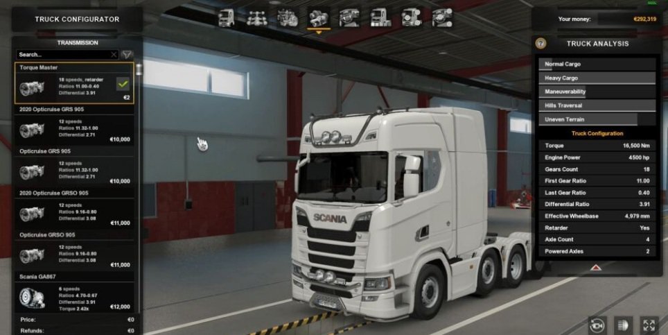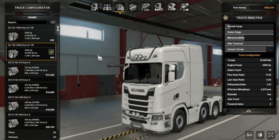 As the title says, I engineered an engine and transmission for the Scania s 2016. They are 2 engines in the pack, one over powered and one extremely powered, the second engine has enough power to tow a mountain. The first engine is unlocked at level 0. The second at level 2. The transmission is 18 speed forward and 1 reverse. It is a speed shift, so very quick shift time. Unlocks at level 0. Works with 1.40. and 1.41 Credits: la1nar, OLSF Credits: la1nar, OLSF |