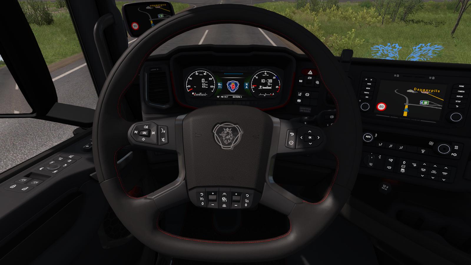 - Animated Steering Wheel - lift axle indicator animation - interior glass reflection - new font looks like a real Scania font