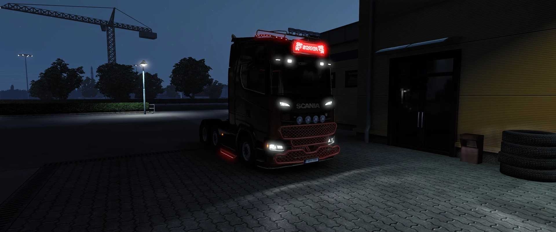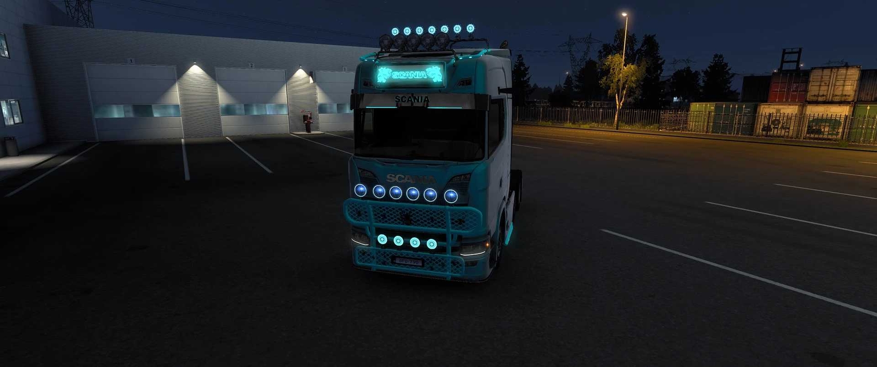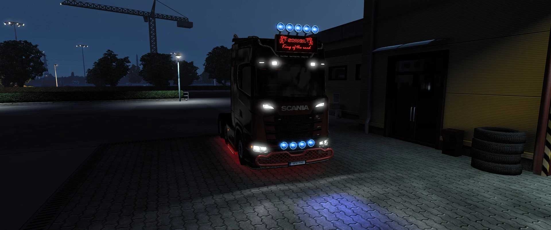 Mod includes: 15 Roof grils with lightbox For Scania S. 10 Front grills for Scania S. Sideskirt sidebars. The idea is that when you change the color of the truck, the neon color and painted grills will change automatically. Credits: papa smurf |