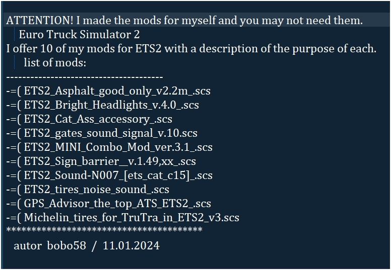 I offer 10 of my mods for ETS2 with a description of the purpose of each.