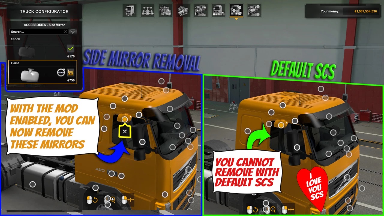 This mod was made to be able to remove the required side mirror on default SCS trucks. The reason I made this was to GAIN some FPS while driving in cab so the game isn't rendering so many mirrors at once (LOW SPEC GANG). The true benefit to this mod is that you can now remove the side mirrors on every truck so it matches the theme of your build better. Below is what requirements were removed from what truck. Daf XF - side mirror Daf E6 - side mirror Iveco Hiway - side mirror Iveco Stralis - side mirror *BONUS* Left exhaust requirement removed aswell. Man TGX- side mirror Man TGX E6 - side mirror Merc Actros- side mirror Merc Actros 2014 - side mirror Magnum - side mirror Premium - no change Range T - no change Scania R - side mirror Scania S - side mirror Scania 2016 R - side mirror Scania 2016 S - side mirror Volvo Classic - side mirror Volvo 2012 - side mirror Credits JonitorMODS Credits: JonitorMODS |