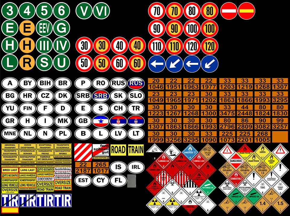 The mod is represented by over 376 signs marking trucks in different categories country codes, speed limit, warning, ecology warning and others. v1.0.97.4 - added slot stickers to trucks Renault Magnum 2009 & Premium Important: Not for trucks Ohaha, RJL, MDModder, MADster, Flemming V, davidzoli, AlexeyP, Pendragon, MrCapital etc! Only for standard trucks in game. Credits: tobrago |