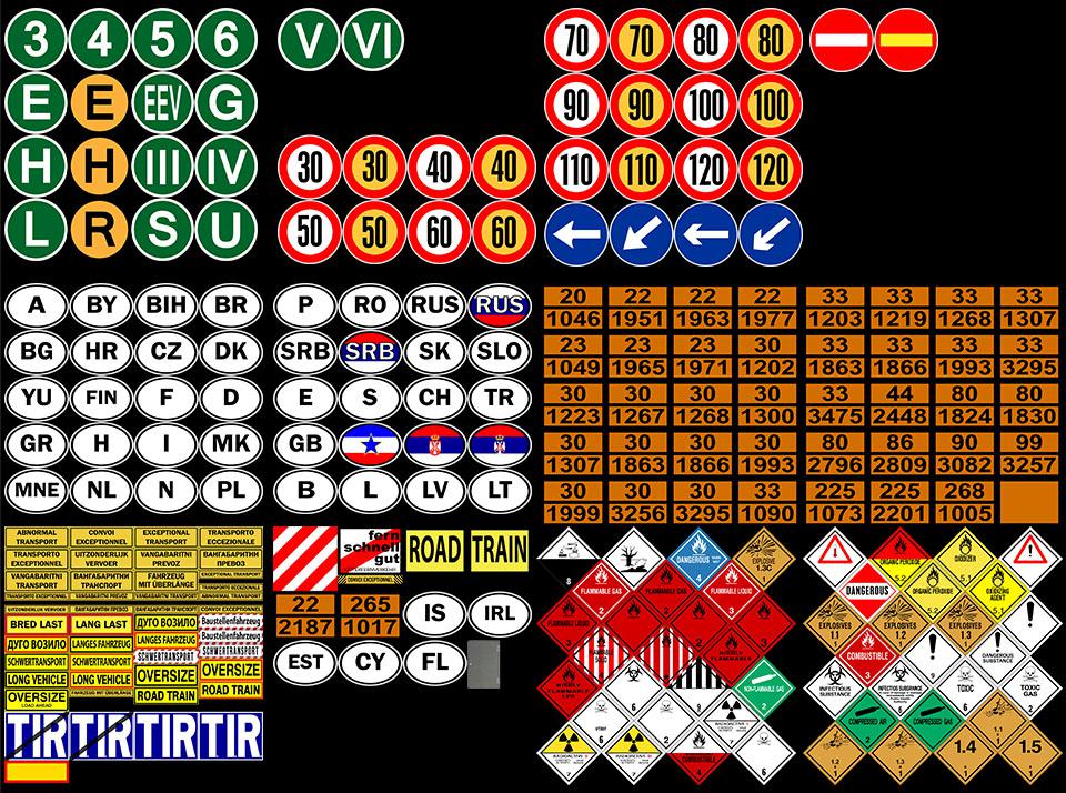 Changelog v1.1.00.94 ---> v1.1.1.56: Adapted to the new version of the game Added Turkish "HGS" for fast passage Added sign "IZREDNI TRAMSPORT" Added Austrian ECO stickers 2, 3, 4, 5, 6 Added country stickers to the front glass cabin A lot was done on translating mod Correction *.sii file Correction *.text file Signs: 3 / 4 / 5 / 6 / E / E (yellow) / EEV / G / H / H (yellow) / IV / L / S / U / III / V / VI / R (yellow) / TIR / No TIR / T.I.R. / No T.I.R. etc. These signs are located at the front of the truck cabin. E = (Environment) or white letter "U" (Umwelt), denoting vehicle with a Euro-1 engine. EEV = Enhanced environmentally friendly vehicle (emission category between V and VI) is a term used in the European emission standards for the definition of a "clean vehicle" > 3.5 tonne in the category M2 and M3. The standard lies between the levels of Euro V and Euro VI. G = denoting Gerauscharm Fahrzeug (ie noiseless/quiet vehicle): German version of the Austrian "L" plate for use only on diesel vehicles meeting German low-noise requirements - similar to those for Austria as above. L = denoting Larmarm Fahrzeug (ie low noise vehicle): Austrian version of the symbol for quiet diesel vehicle which are: - small and medium-sized lorries of no more than 150KW producing noise levels no greater than 78dB. - heavy lorries exceeding 150KW with noise levels no greater than 80dB. S = (Sicher/safe) denoting a vehicle with a Euro-2 engine and safety features. 3 = denoting a vehicle with a Euro-3 engine and safety features. 4 = denoting a vehicle with a Euro-4 engine and safety features. 5 = denoting a vehicle with a Euro-5 engine and safety features. 6 = denoting a vehicle with a Euro-6 engine and safety features. A = required in Germany on all vehicles carrying waste. R (yellow) = The truck has route approval, for ex. heavy transport. (used in Austria). H (yellow) = The truck has higher gross vehicle weight, for ex. heavy transport. (used in Austria). E (yellow) = The truck has restricted gross vehicle weight. Tax benefits for it. (used in Austria). III - VI = European emission standards III-VI for HGVs (> 3.5 tonne). ADR signs: ADR / 22-1951 Argon Refrigerated Liquid / 22-1977 Liquid Nitrogen / 22-2187 Carbon Dioxide Refrigerated Liquid / 23-1965 Liquefied Petroleum Gas LPG / 23-1971 Methane Compressed or Natural Gas Compresed With High Methane Content / 30-1202 Diesel / 30-1223 Kerosene / 30-1267 Crude Oil / 30-1300 Turpentine Substitute / 30-1863 Fuel Aviation Turbine Engine / 30-1999 Tars Liquid Including Road Oils And Cutback Bitumens / 33-1090 Acetone / 33-1203 Gasoline / 33-1219 Isopropanol (Isopropyl Alcohol) / 44-2448 Sulphur Molten / 80-1824 Sodium Hydroxide Solution / 80-1830 Sulphuric Acid / 80-2796 Sulphuric Acid (with Not More Than 51% Acid) / 86-2809 Mercury / 225-1073 Oxygen Refrigerated Liquid / 225-2201 Nitrous Oxide / 90-3082 Environmentally Hazardous Substance Liquid / Dangerous For The Environment / Flammable Materials / Flammable Materials 2 / Flammable Materials 3 / Flammable Solid Miscellaneous Goods Hazard Class 9 Material / Radioactive 1 / Radioactive 2 / Radioactive 3 / 30-1866 Resin Solution Flammable / 33-1866 Resin Solution Flammable / 30-1307 Xylenes / 33-1307 Xylenes / Infectious Material / Toxic Gases / Toxic Material / Corrosive Material / 99-3257 Elevated Temperature Liquid N.O.S. etc. These signs are located at the front of the truck cabin. For more information about ADR. Speed limit signs: 30 / 40 / 50 / 60 / 70 / 80 / 90. The combination of red white and yellow red with black numbers and white background with black numbers. These signs are located at the rear of the truck cabin. Country symbols: Austria, Belarus, Belgium, Bosnia and Hherzegovina, Bulgaria, Croatia, Cyprus, Czech Rrepublic, Denmark, Ex Yugoslavia, Ex East Germany, Ex Soviet Union, Estonia, France, Germany, Greece, Hungary, Island, Ireland, Italy, Latvia, Liechtenstein, Lithuania, Luxembourg, Macedonia, Montenegro, Netherlands, Norway, Poland, Portugal, Romania, Russia, Serbia, Slovakia, Slovenia, Spain, Switzerland, Turkey, United Kingdom, Botswana, Kazakhstan, Moldova, Tajikistan, Uzbekistan etc. These signs are placed at the front and at the rear of the truck cabin. Credits: tobrago |