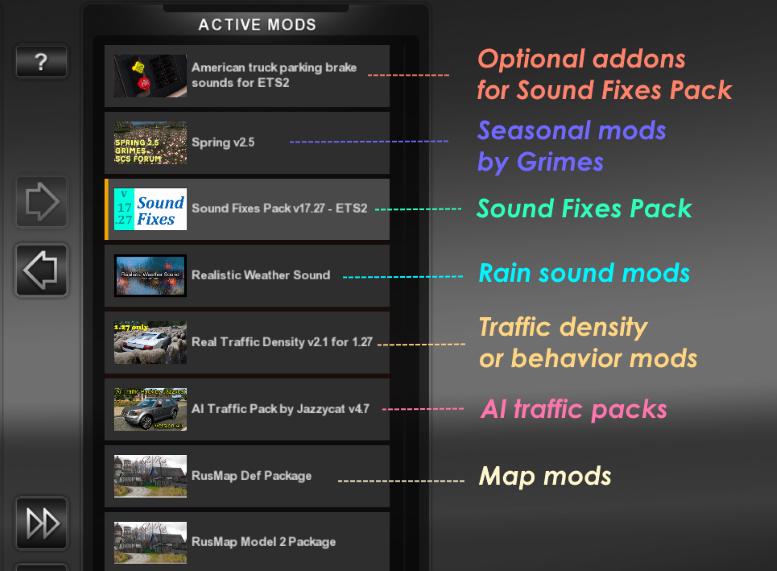 CHANGELOG 18.18 Restored reworked train sounds for AI traffic trains. [ATS edition] Slightly lowered volume of parking brake release sound. [ETS2 edition] Description - Pack provides improvements to common sounds in the game, making them feel more immersive and real. - The goal of the mod is to make the game's sounds feel like real life! - The mod is frequently updated to bring more real sounds into the game. Compatibility * ETS2 1.32.3 + ATS 1.32.4. No errors in game log. Must have high priority in Mod Manager. * Compatible with all trucks, including truck mods. * Does not replace individual truck sounds, so can be used with an unlimited amount of truck sound mods of your choice. * Compatible with all maps. * Supports compatibility with rain sound mods such as Realistic Weather Sound 1.7.7 (provides realistic thunder + rain sounds). Both can be enabled at the same time. Check the load order image included for more details. * If using any of Grimes' seasonal mods, place the seasonal mod with higher priority than the Sound Fixes Pack for a more accurate seasonal experience. * If using winter mods, please enable Frosty Winter Weather Sound addon from Options folder of Sound Fixes Pack for winter sounds. * Traffic density/behavior mods (in lower priority in Mod Manager) can enable realistic sound ranges plugin from Sound Fixes Pack by inserting this line into def/traffic_data.sii: @include "traffic_data_update.sui" Minimum requirements Requires higher priority in Mod Manager than: - any map mods (e.g. ProMods, RusMap, etc.) - any AI traffic mods (e.g. Jazzycat's traffic packs) - any AI traffic density/behavior mods (e.g. those listed in section below)! Set tire and wind volume Wind or tire noise too loud? No problem. You can configure its volume using these developer commands. Syntax is as follows: s_air_noise [value from 0.0 to 1.0] (default is 1) s_wheel_noise [value from 0.0 to 1.0] (default is 1) * SCS Software for base sounds * Drive Safely for pitch, reverberation and sound edits, some sound samples, and for compiling mod * antonvezdehod, Ludmilla and Katixa/Irreo for some tire sounds * Balamut for some key swing and light suspension sounds * AlexeyP for some trailer coupling, gate/barrier and fuel pump sounds, and sounds from Improved Environment Sound * nIGhT-SoN for raindrop definitions * cipinho for some AI traffic sounds * julian for AI traffic sound compatibility update for ETS2 1.32 Credits: Drive Safely |