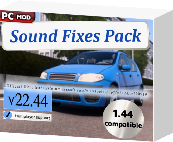 CHANGELOG v22.44 ================ Ford S-Max and Fiat Punto sounds. Minor sound tweaks. Real engine and horn sounds applied to the EMD SD40-2 train locomotive on legacy rail tracks on the map that go in a straight line only. DESCRIPTION =========== – Pack provides essential improvements to common sounds in the game for increased immersion. – For over 6 years, this mod has proven to be a welcome addition for anyone wanting an immersive experience. – The Steam Workshop version is highly recommended for quick and easy updates, maintained for the current game version. – The mod is the most safe on the Steam Workshop, having procedures in place for adapting to major game updates. COMPATIBILITY ============= * ETS2 1.44.1 + ATS 1.44.1. No errors in game log. Must have high priority in Mod Manager. * Supported in single-player and multiplayer Convoy mode. * Compatible with all maps and all trucks, including truck mods. * Does not replace individual truck sounds, so this mod can be used with an unlimited amount of truck sound mods of your choice. MINIMUM REQUIREMENTS ==================== Requires higher priority in Mod Manager than: – any map mods (e.g. ProMods, RusMap, etc.) – any AI traffic mods (e.g. Jazzycat’s traffic packs) – any rain sound mods (unless proven to be compatible) FEATURE LIST ============ The mod features dynamic and realistic sounds, covering the following: – Better variety of suspension and tire bump sounds when driving over curbs or bumps in the road. – Fuel / filling station sounds. – Door close and seatbelt sounds after refueling. – Train sound enhancements, including comprehensive sounds for some individual trains. – Unique railroad crossing bell sounds for different locations. – Real tire and road noise for all terrains: asphalt, gravel, grass, and sleeper lines. – Nokia phone ringtone sound replacing the hurry up / late music, leading to less stress for the player. – Default common sound reworks, such as improved default air brake sounds and a softer default reverse beep. – AI traffic vehicle sound improvements, including sounds for Jazzycat’s Motorcycle Traffic Pack. – English UK/US voice navigation variants with speaker effect added and no unrealistic phrases. – Wind buffeting and rush of air sounds at high speeds only when the window is open. – Improvements to sounds of the environment and animated objects (biplanes for example). – Trailer coupling and trailer brace rotation sounds. – Two standalone air horns. – Softer mix for the Musical Road in American Truck Simulator’s Historic Route 66. – Dynamic exterior and interior rain sounds, and an assortment of varying thunder sounds with delay. – The default wiper sound may now squeak only when the windshield is dry. – (Optional) Reefer / refrigerated trailer sound functionality that can be activated by trailer mods. For further realism, the mod may also add official colors to each AI traffic vehicle it modifies for sound, with rarer colors less likely to be seen. CREDITS ======= * SCS Software for base sounds * Drive Safely for sound edits, some sound samples, and for compiling mod * antonvezdehod and Katixa for some high speed tire sounds * Darkcaptain for a variety of thunder and rain sound samples * Deltatristar500 for an external parking brake sound sample * Grinch for the fallback railroad crossing bell sound * Kass for a variety of thunder sound samples * Kriechbaum for blinker off stick sound and exhaust sounds from his Mack E6 engine sound mod * Trayscapes for recordings of a Mack E6 truck * Vasily EVR for some air brake sound samples * Zeemod for a wind sound sample Credits: Drive Safely |