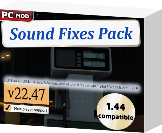 CHANGELOG v22.47 ================ Sound of putting on seatbelt etc. after refuelling is now only played in the interior view (credit to SCS for new FMOD version). Engine and horn sounds added to the 2018 Mercedes-Benz A-Class W177 in AI traffic. [ETS2 edition] Engine and horn sounds added to the 2020 Subaru Outback in AI traffic. [ATS edition] Fuel station interior sound effect volume is now controlled by the Interior sound volume slider DESCRIPTION =========== – Pack provides essential improvements to common sounds in the game for increased immersion. – For over 6 years, this mod has proven to be a welcome addition for anyone wanting an immersive experience. – The Steam Workshop version is highly recommended for quick and easy updates, maintained for the current game version. – The mod is the most safe on the Steam Workshop, having procedures in place for adapting to major game updates. COMPATIBILITY ============= * ETS2 1.44.1 + ATS 1.44.1. No errors in game log. Must have high priority in Mod Manager. * Supported in single-player and multiplayer Convoy mode. * Compatible with all maps and all trucks, including truck mods. * Does not replace individual truck sounds, so this mod can be used with an unlimited amount of truck sound mods of your choice. MINIMUM REQUIREMENTS ==================== Requires higher priority in Mod Manager than: – any map mods (e.g. ProMods, RusMap, etc.) – any AI traffic mods (e.g. Jazzycat’s traffic packs) – any rain sound mods (unless proven to be compatible) FEATURE LIST ============ The mod features dynamic and realistic sounds, covering the following: – Better variety of suspension and tire bump sounds when driving over curbs or bumps in the road. – Fuel / filling station sounds. – Door close and seatbelt sounds after refueling. – Train sound enhancements, including comprehensive sounds for some individual trains. – Unique railroad crossing bell sounds for different locations. – Real tire and road noise for all terrains: asphalt, gravel, grass, and sleeper lines. – Nokia phone ringtone sound replacing the hurry up / late music, leading to less stress for the player. – Default common sound reworks, such as improved default air brake sounds and a softer default reverse beep. – AI traffic vehicle sound improvements, including sounds for Jazzycat’s Motorcycle Traffic Pack. – English UK/US voice navigation variants with speaker effect added and no unrealistic phrases. – Wind buffeting and rush of air sounds at high speeds only when the window is open. – Improvements to sounds of the environment and animated objects (biplanes for example). – Trailer coupling and trailer brace rotation sounds. – Two standalone air horns. – Softer mix for the Musical Road in American Truck Simulator’s Historic Route 66. – Dynamic exterior and interior rain sounds, and an assortment of varying thunder sounds with delay. – The default wiper sound may now squeak only when the windshield is dry. – (Optional) Reefer / refrigerated trailer sound functionality that can be activated by trailer mods. For further realism, the mod may also add official colors to each AI traffic vehicle it modifies for sound, with rarer colors less likely to be seen. CREDITS ======= * SCS Software for base sounds * Drive Safely for sound edits, some sound samples, and for compiling mod * antonvezdehod and Katixa for some high speed tire sounds * Darkcaptain for a variety of thunder and rain sound samples * Deltatristar500 for an external parking brake sound sample * Grinch for the fallback railroad crossing bell sound * Kass for a variety of thunder sound samples * Kriechbaum for blinker off stick sound and exhaust sounds from his Mack E6 engine sound mod * Trayscapes for recordings of a Mack E6 truck * Vasily EVR for some air brake sound samples * Zeemod for a wind sound sample Credits: Drive Safely |