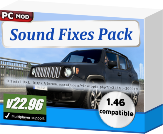 NEW CHANGES ================ Reduced probability of interior key noises for sharp/sudden cabin movements. Engine sounds added to the 2022 Toyota Tundra in AI traffic. [ATS edition] Compatibility updates for the Texas DLC. [ATS edition] Reduced probability of interior cabin noises for sharp/sudden cabin movements. Engine and horn sounds added to the 2007 GMC Sierra (3rd generation) in AI traffic. [ATS edition] Engine and horn sounds added to the 2015 Jeep Renegade (pre-facelift) in AI traffic. [ETS2 edition] DESCRIPTION =========== – Pack provides essential improvements to common sounds in the game for increased immersion. – For over 7 years, this mod has proven to be a welcome addition for anyone wanting an immersive experience. – The Steam Workshop version is highly recommended for quick and easy updates, maintained for the current game version. – The mod is the most safe on the Steam Workshop, having procedures in place for adapting to major game updates. COMPATIBILITY ============= * ETS2 1.46.1 + ATS 1.46.1. No errors in game log. Must have high priority in Mod Manager. * Supported in single-player and multiplayer Convoy mode, and is marked as an optional mod in Convoy. * Compatible with all maps and all trucks, including truck mods. * Does not replace individual player truck sounds, so this mod can be used with an unlimited amount of truck sound mods of your choice. MINIMUM REQUIREMENTS ==================== Requires higher priority in Mod Manager than: – any map mods (e.g. ProMods, RusMap, etc.) – any AI traffic mods (e.g. Jazzycat’s traffic packs) – any rain sound mods (unless proven to be compatible) FEATURE LIST ============ The mod features dynamic and realistic sounds, covering the following: – Extensive variety of suspension, tire bump, cabin noise, cabin rattle, and key jingle sounds. – Fuel / filling station sounds. – Door close and seatbelt sounds after refueling. – Train sound enhancements, including comprehensive sounds for some individual trains. – Unique railroad crossing bell sounds for different locations. – Real tire and road noise for all terrains: asphalt, gravel, grass, and sleeper lines. – Nokia phone ringtone sound replacing the hurry up / late music, leading to less stress for the player. – Default common sound reworks, such as improved default air brake sounds and a softer default reverse beep. – AI traffic vehicle sound improvements, including sounds for Jazzycat’s Motorcycle Traffic Pack. – English UK/US voice navigation variants with speaker effect added and no unrealistic phrases. – Wind buffeting and rush of air sounds at high speeds only when the window is open. – Improvements to sounds of the environment and animated objects. – Trailer coupling and trailer brace rotation sounds. – Two standalone air horns. – Softer mix for the Musical Road in American Truck Simulator’s Historic Route 66. – Dynamic exterior and interior rain sounds, and an assortment of varying thunder sounds with delay. – The default wiper sound may now squeak only when the windshield is dry. – (Optional) Reefer / refrigerated trailer sound functionality that can be activated by trailer mods. For further realism, the mod may also add official colors to each AI traffic vehicle it modifies for sound, with rarer colors less likely to be seen. CREDITS ======= * SCS Software for base sounds * Drive Safely for sound mixing and editing, some sound samples, and for compiling the mod * antonvezdehod and Katixa for some high speed tire sounds * Balamut for some key sound samples * Darkcaptain for a variety of thunder and rain sound samples * Deltatristar500 for an external parking brake sound sample * Grinch for the fallback railroad crossing bell sound * Kass for a variety of thunder sound samples * Kriechbaum for blinker off stick sound and exhaust sounds from his Mack E6 engine sound mod * Trayscapes for recordings of a Mack E6 truck * Vasily EVR for some air brake sound samples * Zeemod for a wind sound sample Credits: SCS Software, Drive Safely, antonvezdehod, Balamut, Darkcaptain, Deltatristar500, Grinch, Kass, Katixa, Kriechbaum, Trayscapes, Vasily EVR, Zeemod Credits: Drive Safely, antonvezdehod, Balamu |