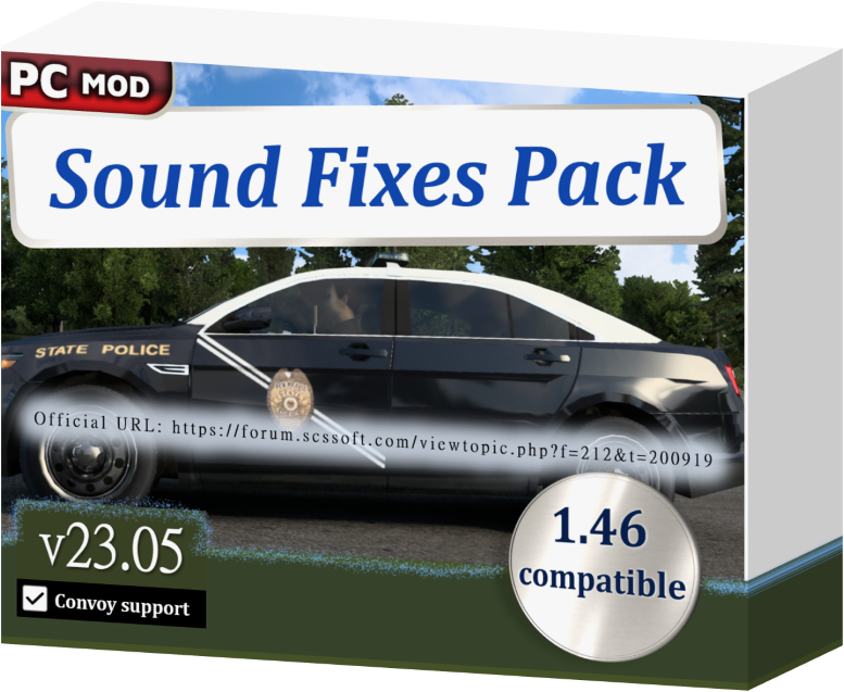 CHANGELOG v23.05 ================ Engine and horn sounds added to the civilian 2016 Ford Explorer Limited in AI traffic. [ATS edition] Engine sounds added to the Ford (Explorer) Utility Police Interceptors in AI traffic. [ATS edition] Revised the engine sound of the 2003 Ford Crown Victoria in AI traffic. [ATS edition] Minor sound adjustments for the International LoneStar and International LT trucks in AI traffic. [ATS edition] Tweaks to the Sound Fixes Pack variant of the English Skye UK voice navigation option: – Improved speaker effect for the last ‘exit’ word in the roundabout phrase. – ‘Go straight’ phrase changed to ‘Continue straight on’. Recommended audio settings information in the text file and the Steam Workshop discussions topic updated. “Safe Mode” for Sound Fixes Pack on the Steam Workshop now updated with the Skye UK voice navigation tweaks from v23.05. CHANGELOG v23.04 ================ Default grinding sound when engine speed and road speed are only slightly misaligned should now be less apparent. – This feature is exclusive to users with manual gear shifters only (not applicable to keyboard and mouse). Rework of default gear grinding sounds. – Replaced 3 default gear grind / damaged gear sound effects. – Added 3 new variations of default gear grind / damaged gear sound effects. – Damaged gearbox sounds are now an interior sound to allow for a clearer sound in the cabin, with the tradeoff of no exterior sound. Changed and added a few sound effects for the default air brake sound replacements, now totalling at 17 variations. 1 new additional variation of the default air cutoff sound for when the air compressor is unloaded by the governor. Horn sounds added to the civilian 2013 Ford Taurus in AI traffic. [ATS edition] Engine and horn sounds added to the 2013 Ford Taurus police cars in AI traffic. [ATS edition] Slight increase in sound volume of some of the default air brake sound replacement sound effects. Slight decrease in sound distance range of the lawn mower sound. DESCRIPTION =========== – This mod brings more immersion to common sounds in the game. – For over 7 years, this mod has proven to be an essential addition for anyone wanting an immersive experience. – The Steam Workshop version is highly recommended for quick and easy updates, maintained for the current game version. – The mod is the most safe on the Steam Workshop, having procedures in place for adapting to major game updates. COMPATIBILITY ============= * ETS2 1.46.2 + ATS 1.46.2. No errors in game log. Must have high priority in Mod Manager. * Supported in single-player and multiplayer Convoy mode, and is marked as an optional mod in Convoy. * Compatible with all maps and all trucks, including truck mods. * Does not replace individual player truck sounds, so this mod can be used with an unlimited amount of truck sound mods of your choice. MINIMUM REQUIREMENTS ==================== Requires higher priority in Mod Manager than: – any map mods (e.g. ProMods) – any AI traffic mods (e.g. Jazzycat’s traffic packs) – any rain sound mods (unless proven to be compatible) FEATURE LIST ============ The mod features dynamic and realistic sounds, covering the following: – Extensive variety of suspension, tire bump, cabin noise, and cabin rattle sounds. – Fuel / filling station sounds. – Door close and seatbelt sounds after refueling. – Train sound enhancements, including comprehensive sounds for some individual trains. – Unique railroad crossing bell sounds for different locations. – Real tire and road noise for all terrains: asphalt, gravel, grass, and sleeper lines. – Nokia phone ringtone sound replacing the hurry up / late music, leading to less stress for the player. – Default common sound reworks, such as improved default air brake sounds and a softer default reverse beep. – AI traffic vehicle sound improvements, including sounds for Jazzycat’s Motorcycle Traffic Pack. – English UK/US voice navigation variants with speaker effect added and no unrealistic phrases. – Wind buffeting and rush of air sounds at high speeds only when the window is open. – Improvements to sounds of the surrounding environment and animated objects. – Trailer coupling and trailer brace rotation sounds. – Two standalone air horns. – Softer mix for the Musical Road in American Truck Simulator’s Historic Route 66. – Dynamic exterior and interior rain sounds, and an assortment of varying thunder sounds with delay. – The default wiper sound may now squeak only when the windshield is dry. – Default gear grinding sound effect additions and improvements. – (Optional) Reefer / refrigerated trailer sound functionality that can be activated by trailer mods. For further realism, the mod may also add official colors to each AI traffic vehicle it modifies for sound, with rarer colors less likely to be seen. CREDITS ======= * SCS Software for base sounds * Drive Safely for sound mixing and editing, some sound samples, and for compiling the mod * antonvezdehod and Katixa for some high speed tire sounds * Darkcaptain for a variety of thunder and rain sound samples * Deltatristar500 for an external parking brake sound sample * Grinch for the fallback railroad crossing bell sound * Kass for a variety of thunder sound samples * Kriechbaum for blinker off stick sound and exhaust sounds from his Mack E6 engine sound mod * Trayscapes for recordings of a Mack E6 truck * Vasily EVR for some air brake sound samples * Zeemod for a wind sound sample Credits: SCS Software, Drive Safely, antonvezdehod, Darkcaptain, Deltatristar500, Grinch, Kass, Katixa, Kriechbaum, Trayscapes, Vasily EVR, Zeemod Credits: Drive Safely, antonvezdehod, Darkca |