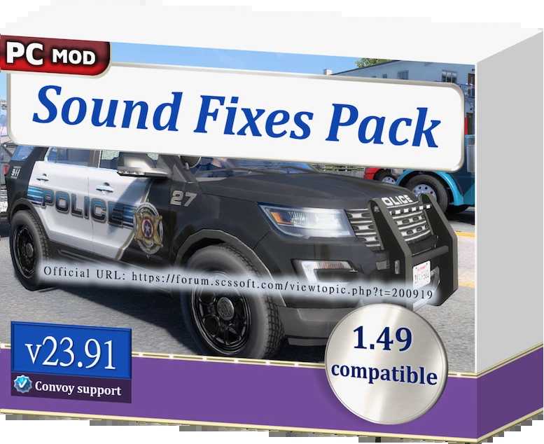 Compatibility updates for the Kansas DLC and ATS 1.49.2. [ATS edition] Engine sounds added to the 2007 Peugeot Boxer Mk2 in AI traffic. [ETS2 edition] Compatibility patch for the upcoming version of Winter sounds. [ETS2 edition] Minor sound adjustments for some AI traffic car engine sounds. [ETS2 edition] Horn sound added to the 2016 Ford (Explorer) Utility Police Interceptors in AI traffic. [ATS edition]