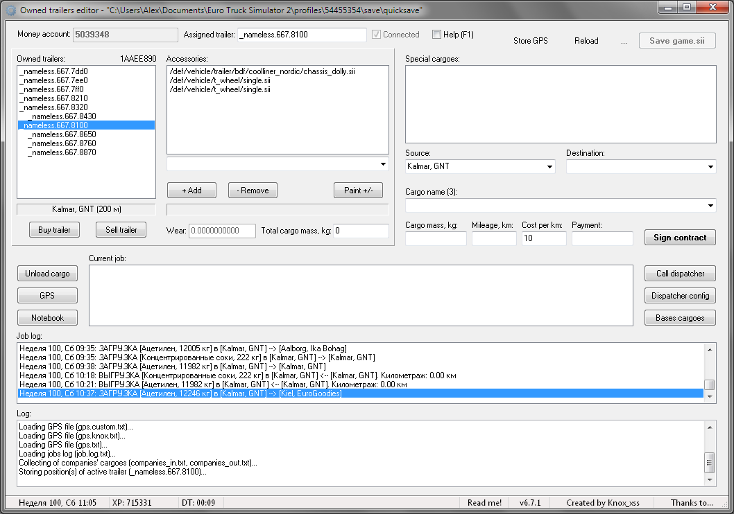 TEDIT v6.7.1 (+ v6.13.1.1) This version supports multi-trailers (doubles, triples, etc.). How to build, load and unload them – see the video “Multiply trailers – build, load, unload.mp4”. While loading the cargo in the trailer, the weight is distributed evenly between the trailer and his truck (trailer leading), but only have the leading no jobs! Now every load has the coefficients of the COG (the cog file.txt). If the application detects absence of COG from the load, then by default COG (0, 0.4444, 0) will be used. You can manually change the COG of each load in the program (in the “Bases cargoes”window). Now in the “Hotkeys config” window the key codes are represented by names instead of numeric codes. It is now possible to cancel the selected task by pressing the [Delete] key in the task list. Now when selling a trailer, the prices from the trailers file are taken into account.txt. Updated utilities. More info in ReadMe Credits: knox_xss Credits: knox_xss |
