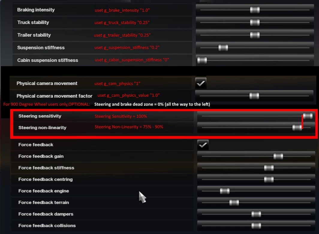 This mod brings the Truck and trailer behavior to more realism. The adjustments change the physical properties of the Truck cab, suspension, chassis and trailer. It also adjusts the pneumatic seat, brakes and transmission. – Adjusted truck chassis suspension travel and damping – stability of cab – tilt angels- forward/backward and roll adjusted on cab – Adjusted trailer suspension and damping – brake system configured (strength, intensity, wear and heating) – transmission now makes u feel a heavy load – front wheel rotation and angel adjusted – camera movement configured – Increased wind resistance – Adjusted steering parameters (Credit TheTiger) – Many more adjustments uset g_cam_physics_value “1.0” uset g_cam_physics “1” uset g_cabin_suspension_stiffness “0” uset g_suspension_stiffness “0.2” uset g_trailer_stability “0.25” uset g_truck_stability “0.25” uset g_brake_intensity “1.0” For 900 Degree Wheel users only, OPTIONAL: (Not needed but adds to the realism) Steering Sensitivity = 100% Steering Non-Linearity = 75% – 90% Steering and brake dead zone = 0% (all the way to the left) This mod should work with all default trucks and the moded ones: – RJL Scania G,R,R4-Series & Streamline – RJL Scania T,T4- Series – Ford F- Max (SimulasyonTURK) – Mercedes Benz MP5 (Actros 5Crew) – DAF NTT(XBS) – Mercedes-Benz SK (XBS) – DAF 95 Ati (XBS) – Man TGX 2020 (HBB) – Iveco S-Way (HBB) – Man TGX Euro 6 (MADster paid) – Man TGX E6 2015 (Glover) – Mercedes-Benz Actros MP2 Black Edition (Dotec) – Mercedes-Benz Actros MP2 (Dotec) – Mercedes-Benz Actros MP3 (Dotec) Credits: MrPapaBear |