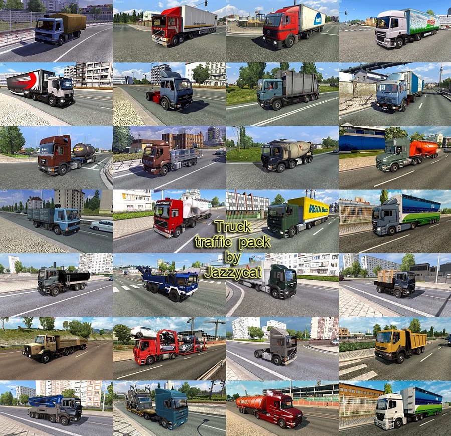 Pack adds in traffic 120 trucks and BDF’s (Mercedes Benz (MP2, MP4, Axor, Antos, SK, LK, NG, Atego, Econic), Scania (143M, 164L, P-series), Iveco Eurocargo, Trakker, Volvo (F10, FH12, FMX, FL7), MAN (TGA, TGS, F2000, TLF, TGM, Kat-1), Pegaso Troner, Tatra Phoenix, DAF CF, Renault (Premium DCI, Kerax, Major, C280), Ford (F-Max, Cargo), Sisu E14, various variants of bdf’s and special trucks). All standalone. Works on any maps. Tested on version 1.41.x Compatible with all my packs. Version 5.8 – added new truck Renault Range T Tank Truck Credits: JC |