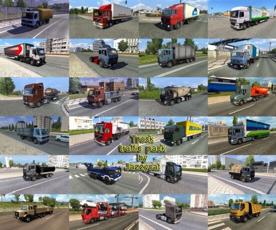 Pack adds in traffic 123 trucks and BDF’s (Mercedes Benz (MP2, MP4, Axor, Antos, SK, LK, NG, Atego, Econic), Scania (143M, 164L, P-series), Iveco Eurocargo, Trakker, Volvo (F10, FH12, FMX, FL7), MAN (TGA, TGS, F2000, TLF, TGM, Kat-1), Pegaso Troner, Tatra Phoenix, DAF CF, Renault (Premium DCI, Kerax, Major, C280), Ford (F-Max, Cargo), Sisu E14, various variants of bdf’s and special trucks). All standalone. Works on any maps. Tested on version 1.42.x Compatible with all my packs. Version 6.1 – added new truck MAN TGX Euro 6 Tank Truck Credits: JC |