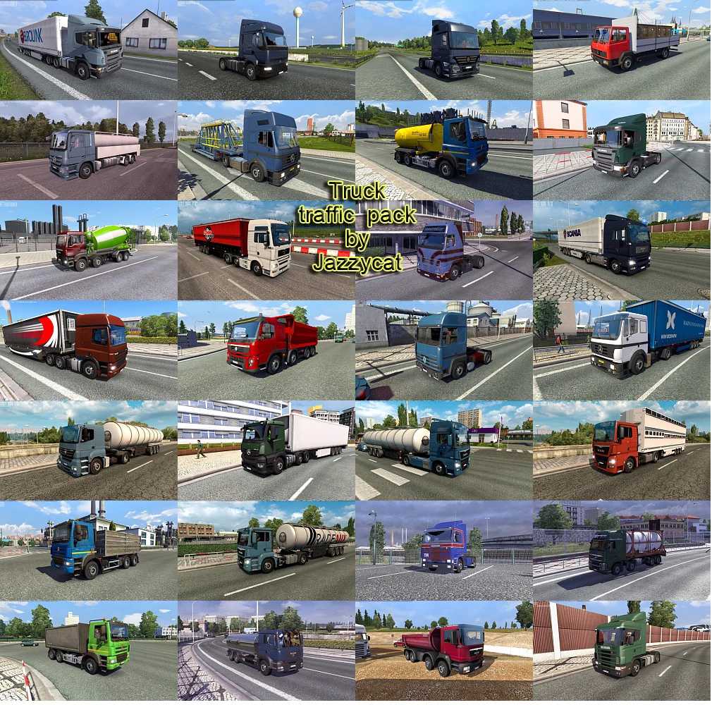 Pack adds in traffic 127 trucks and BDF’s (Mercedes Benz (MP2, MP4, Axor, Antos, SK, LK, NG, Atego, Econic), Scania (143M, 164L, P-series), Iveco Eurocargo, Trakker, Volvo (F10, FH12, FMX, FL7), MAN (TGA, TGS, F2000, TLF, TGM, Kat-1), Pegaso Troner, Tatra Phoenix, DAF CF, Renault (Premium DCI, Kerax, Major, C280), Ford (F-Max, Cargo), Sisu E14, various variants of bdf’s and special trucks). All standalone. Works on any maps. Tested on version 1.43.x Compatible with all my packs. Version 6.5 – added new truck Renault Range T Swap Body Credits: JC |