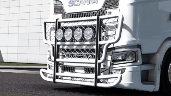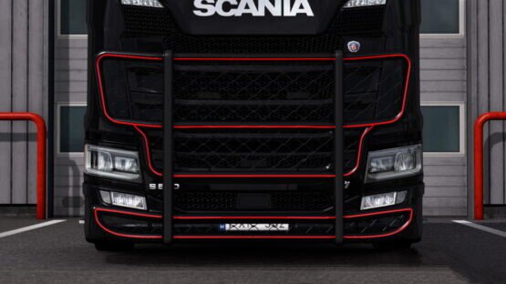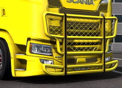 I wasn’t really satisfied with the available Trux bullbar mods so I created this, a painted version of the vanilla Goliath bullbar, resembling the Trux Highway. TEMPLATE INCLUDED! Also included a .dds to help creating lines on the model. For skins, add this line in the accessory.sii of the skin: acc_list[]: “f_grill.shape6p” Tested on 1.39 and 1.40 (thanks Alberto!) Have fun! Credits: SCS, TheNuvolari Credits: TheNuvolari |