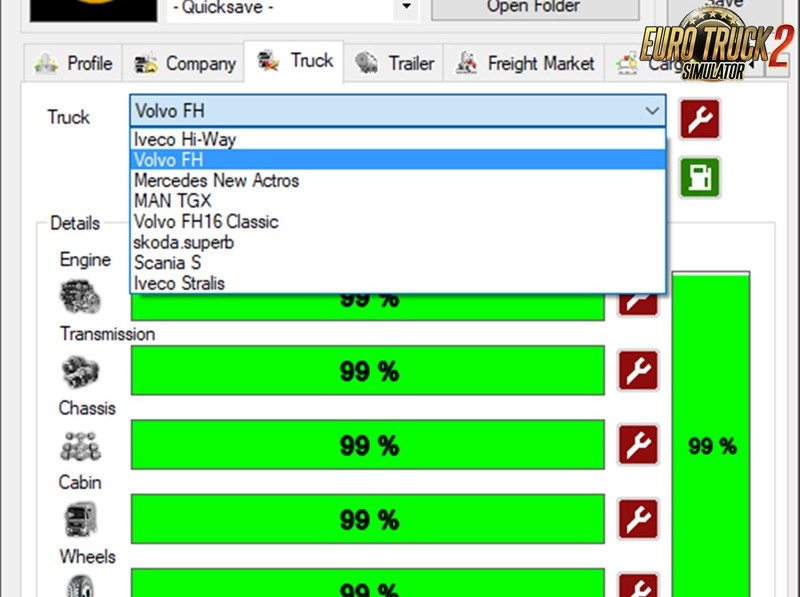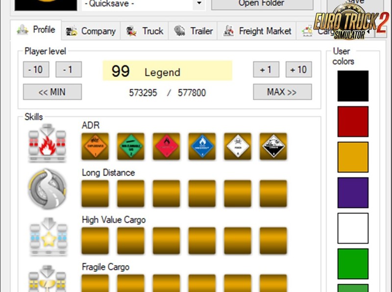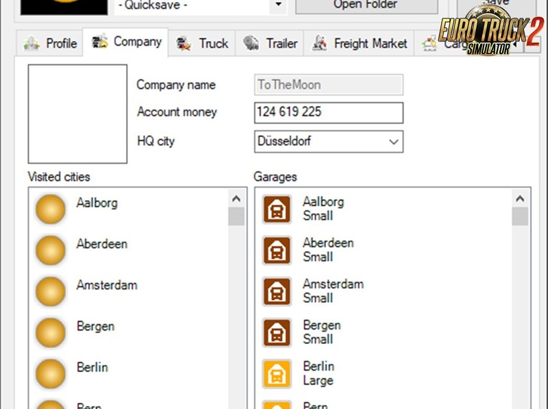 Change log Fixed game change button bug Small UI fixes Right now, this tool is in alpha state and can broke save file so be caution. If you encounter problem please make a screenshot, leave a message and send me a save file (if it required). Supported save file version 39 (Tested on 1.33.x) Description This program created for editing game save files. You can: edit player level and skill. edit saved colors for truck and trailer. edit company HQ and amount of money on account. repair and\or refuel your truck. share truck paint job. user colors. create custom job for Freight market. make basic edits to Cargo market. share GPS coordinates and paths that can be useful for Convoys. Short term goals: finish sharing functions for truck parts. add editing and share functions for trailers. add the ability to edit files from custom path. Long term goals: add the ability to creat jobs for Cargo market (have couple ideas) This tool depends on: .NET Framework 4.6.1 Credits: LIPtoH |