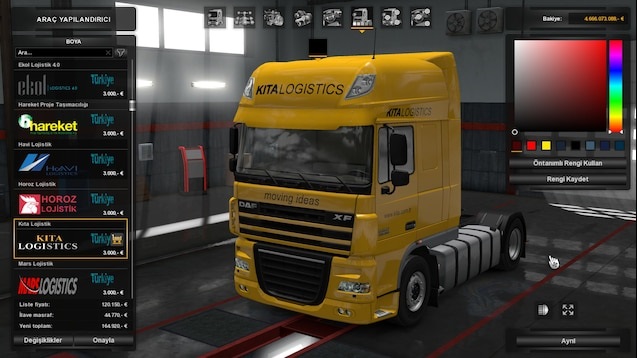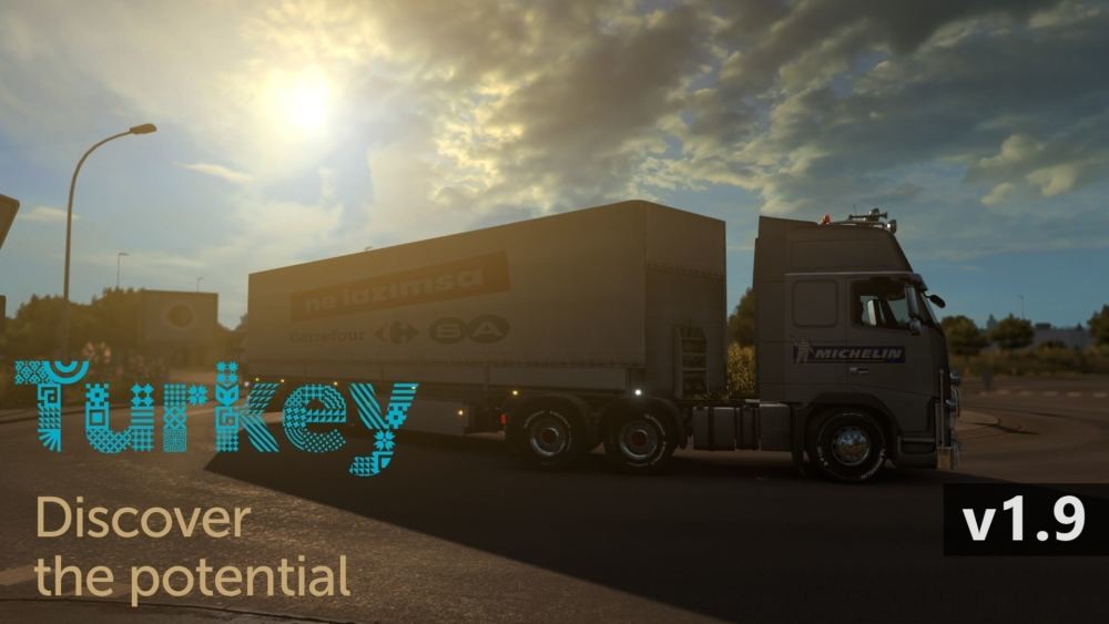 EN Euro Truck Simulator 2 Turkish Companies mod updated to version 1.9! What’s new with v1.9 *MAN TGX Euro 6 added in the paint jobs pack. *Scania R & S 2016 adapted to the new paint jobs system. General Description The companies in the game are separated by type; trailers, company center logos, transport market’s logos, names, flags and road side company sign have been replaced by real Turkish companies in the field. TR Euro Truck Simulator 2 Türk Firmaları modu 1.9 sürümüne güncellendi! v1.9 ile gelen yenilikler *MAN TGX Euro 6 boya paketine eklendi. *Scania R & S 2016 yeni paint jobs sistemine uyarlandı. Genel Açıklama Oyundaki firmalar türlerine göre ayrılarak; dorseleri, şirket merkezi logoları, nakliye piyasası logoları, isimleri, bayrakları ve yol kenarı işaret levhaları alanındaki dev Türk şirketleriyle değiştirilmiştir. Credits: Sinagrit Baba Companies: İtcc = 3M Drekkar Trans = ADAR TRANS Nordic Stenbrott = ADO MADENCİLİK Tree ET = AGT Wilnet Transports = ALİŞAN LOJİSTİK Globeur = BALNAK NAKLİYAT ve LOJİSTİK HİZMETLERİ Nordic Crown = BANVİT SellPlan = BİM Gnt = BORUSAN LOJİSTİK Sag & Tre = BOYTAŞ MOBİLYA SANAYİ ve TİCARET A.Ş. Kaarfor = CARREFOURSA Lkw = CEVA LOJİSTİK Polar Fish = DARDANEL ÖNENTAŞ GIDA SANAYİ A.Ş Scout = DOĞUŞ OTOMOTİV Posped = EKOL LOJİSTİK 4.0 PK 900 = ELTAŞ TRANSFORMATÖR SANAYİ Konstnorr = ENKA İNŞAAT ve SANAYİ A.Ş. MS Stein = ETİ BAKIR Steinbruch = ETİ GÜMÜŞ Nucleon = ELEKTRİK ÜRETİM ANONİM ŞİRKETİ (EÜAŞ) EuroGoodies = FASDAT GIDA Bhv = FORD OTOSAN Vitas Power = HAREKET PROJE TAŞIMACILIĞI ve YÜK MÜHENDİSLİĞİ A.Ş. Eurohauler = HAREKET PROJE TAŞIMACILIĞI ve YÜK MÜHENDİSLİĞİ A.Ş. Renar Logistik = HAVİ LOJİSTİK Tradeaux = HOROZ LOJİSTİK Mvm = İMBAT MADENCİLİK Trameri = İMBAT MADENCİLİK Writigen 808 = KARAYOLLARI GENEL MÜDÜRLÜĞÜ Bjork = KASTAMONU ENTEGRE Aria = KEREVİTAŞ Nos Paturages = KESKİNOĞLU İka Bohag = KİPA Stokes = KITA LOJİSTİK Chimi = KOROZO AMBALAJ Nbfc = KÖKSAN Gomme du Monde = LASSA Lisette Logistics = MARS LOJİSTİK Boisserie Jean-Pierre = MERKEZ ÇELİK SANAYİ ve TİCARET A.Ş. Container Port = MERSİN ULUSLARARASI LİMAN İŞLETMECİLİĞİ A.Ş. Gallia Ferry = MERSİN ULUSLARARASI LİMAN İŞLETMECİLİĞİ A.Ş. Port de Conteneur = MERSİN ULUSLARARASI LİMAN İŞLETMECİLİĞİ A.Ş. Marina = MERSİN MARİNA Norrfood = MİGROS TransiNet = NETLOG LOJİSTİK Norrsken = OMSAN LOJİSTİK Eco = OMV PETROL OFİSİ A.Ş. Vpc = OTOKAR Bcp = OTOKOÇ OTOMOTİV Fcp = OYAK RENAULT NS Chemicals = PETKİM PETROKİMYA HOLDİNG A.Ş. EuroAcres = PINAR Sanbuilders = POLİMEKS İNŞAAT TAAHHÜT ve SANAYİ TİCARET A.Ş. Polarislines = REYSAŞ LOJİSTİK Batisse = RÖNESANS HOLDİNG Rex-Tex 45 = SARILAR GROUP Wgcc = SASA POLYESTER Dans le Jardin = TAT GIDA Bossloc = TCDD Voitureux = TOFAŞ TÜRK OTOMOBİL FABRİKASI A.Ş. Agronord = TUKAŞ GIDA SANAYİ ve TİCARET A.Ş. Fle = TURKISH CARGO Bhb = TÜRKİYE PETROL RAFİNERİLERİ A.Ş Huilant = TÜRKİYE PETROL RAFİNERİLERİ A.Ş NS Oil = TÜRKİYE PETROL RAFİNERİLERİ A.Ş Subse = ÜLKER Credits: Sinagrit Baba |