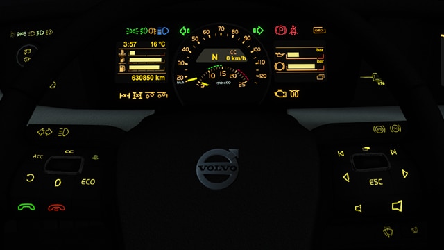 v1.2.0: Changed the Volvo logo when starting the engine (By changing this, the logo on the steering wheel will also change) Change the color of odometer, gear position, cruise control settings, and digital speed. * Change the dashboard color of Vovlo FH (FH16 2012) to like gold. Credits: Alphaziel |