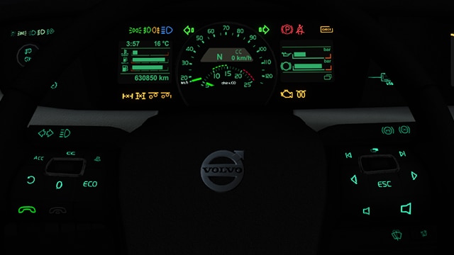 v1.2.0: Changed the Volvo logo when starting the engine (By changing this, the logo on the steering wheel will also change) Change the color of odometer, gear position, cruise control settings, and digital speed. * Change the dashboard tint of Vovlo FH (FH16 2012) to greenish Credits: Alphaziel |
