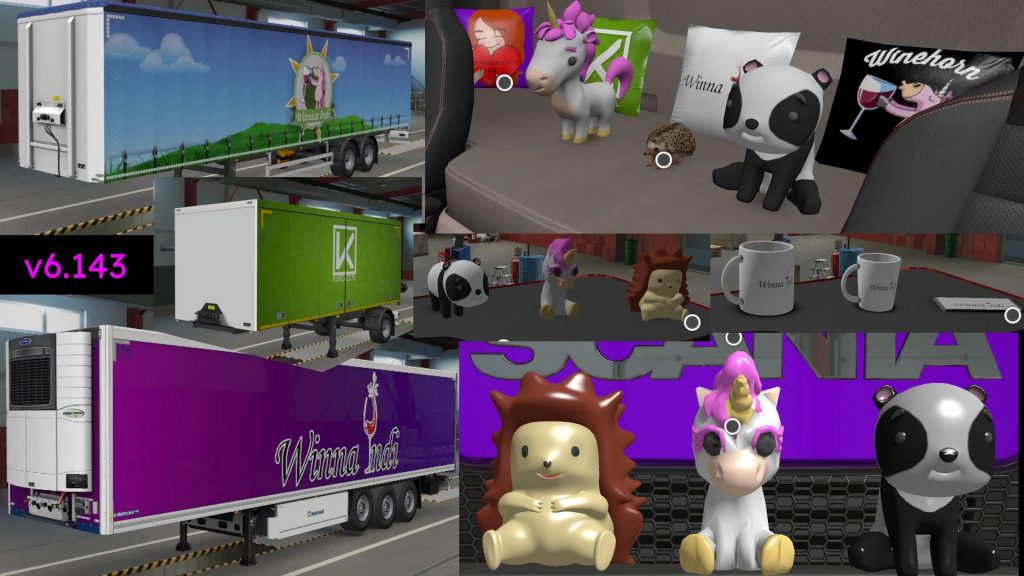 – Added over 80 types and variants of cabin and truck accessories – Added trailer paintjobs for cisterns and “box” trailers (courtainside, dry freighter, etc.) – Mirrors FOV – Map zoom level, colors, and background – Rebranded one company in France – Added cargo for Standard (STD), Flatbed Drop Side (FLB), and Food Cistern (FDT) trailers – Replaced some driver photos (also usable as player image) – Replaced one company logo Update 9 April: Fixed: short dry van trailer paint “Winnica Indi”, container for Winehorn Wine from Winnica Indi (now it is loading not only trailer, but also actual container for it). Added: new model of mugs, new model of smartphone, new paintjobs for STD trailer, new paintjob for Krone trailers, paintjob for Live Winehorns trailer and new Winehorn species (cargo), toys for seat, bed and dashboard, lamps for truck grills, compatibility for multiple trucks added in mods (cabin and truck accessories should be visible on 45 trucks, including 18 default ETS2). New models of pillows and cups were introduced. File names (in mod) and item names (in game) were also unified and simplified making everything easier to maintain and expand in future. Credits: szymonkurzacz Credits: szymonkurzacz |