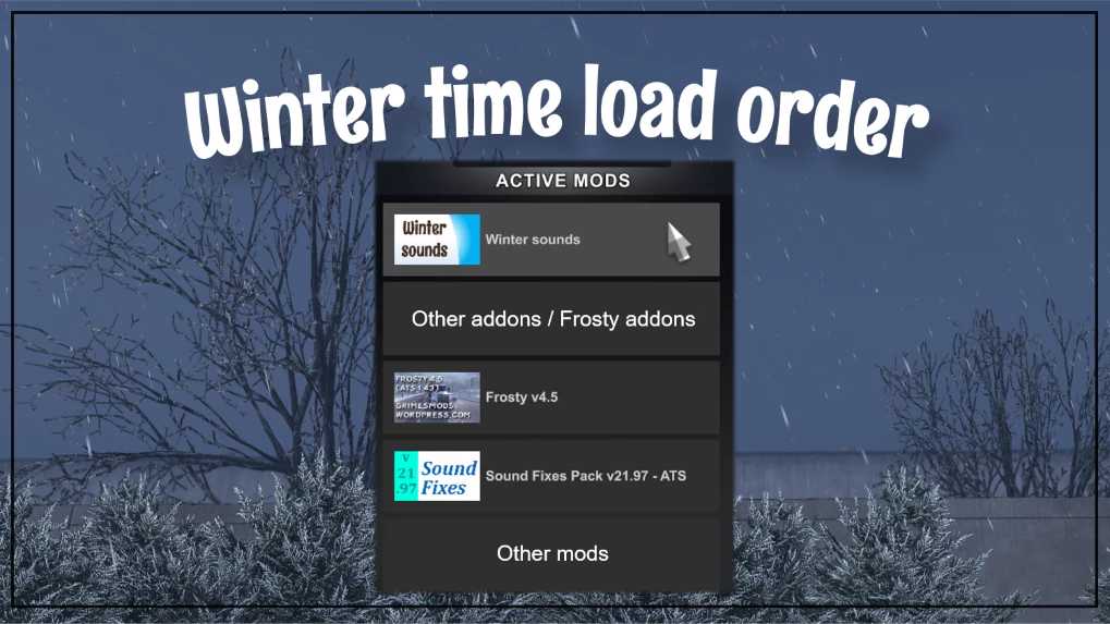New in version 4: Muted lawn mowing sound and another forest bird ambient sound (Sound Fixes Pack required to be enabled for these features). This mod aptly reworks sounds for a snowy winter season. Are you ready to brave and immerse yourself for the coldest season? Features: – The subtle sound of snowfall. – Feel the multiple layers of howling wind and gusts during intensified storms. – Simulated unique combinations of wind sound effects during intensified storms as you step outside your truck. – Chances of hearing thundersnow sounds with a varying proximity. The further it is, the more it gets muffled by snow. – A reworked default wiper sound with audio of it wiping sleet on the windshield. – The default wiper sound to have the possibility of squeaking when the windshield is dry. Exclusive features: The following features only work when used along with the Sound Fixes Pack – Less insect and bird ambient sounds due to the snowy winter season. – Muted lawn mowing sound. – Sound of air conditioning system on the Tesla Model S in AI traffic when the player camera is near the hood of the car. [ATS only] – Limited spawn of non-winter-oriented base game AI traffic vehicles such as open top vehicles and ice cream vans. Compatibility notes: Tested on 1.46, 1.45, 1.44, 1.43, 1.42, and 1.41. Requires higher priority than the Sound Fixes Pack, the Frosty Winter Weather mod, and any rain sound mods to work correctly. Thundersnow sound feature might only apply with the Frosty Winter Weather mod for American Truck Simulator. For more immersion: While not mandatory, the mod is highly recommended and designed to work with the following for an immersive experience: Frosty Winter Weather Mod by Grimes. Sound Fixes Pack. As part of the Sound Fixes Pack Collection, this mod may get further updates to cover more wintry aspects. Stay tuned! Credits: Drive Safely |