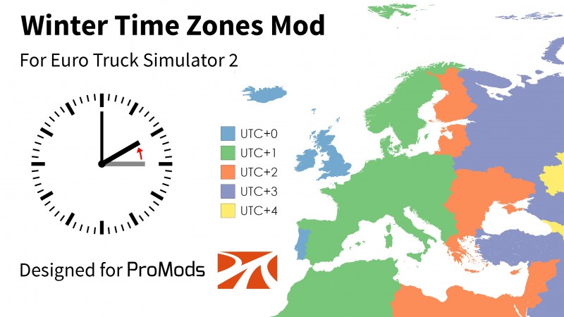 This mod changes the time zones of all countries that use daylight saving time to their original time zone. Designed for use with the ProMods main card and the Middle-East Add-On Pack. It can work with a standard card or with other card mods, but full functionality is not guaranteed. It is recommended to include full information about the time zone in the gameplay and use this mod in conjunction with the current daylight duration mod, especially in winter, as well as other late autumn or winter mods for greater realism. Credits: tkk7406 |