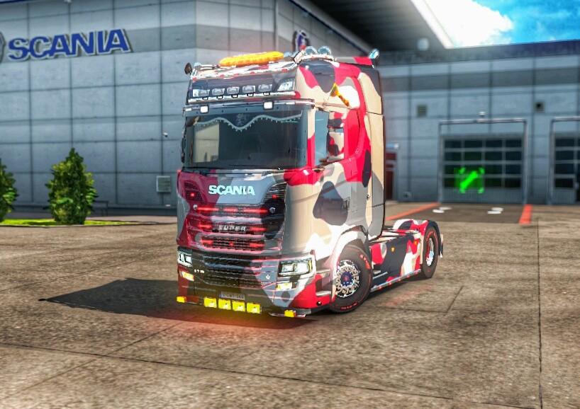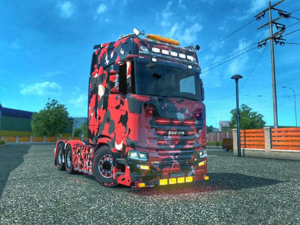 5 skins. Tested version 1.32 Enjoy it Try also it with Scania S camouflage skin pack Credits: MoGo |
