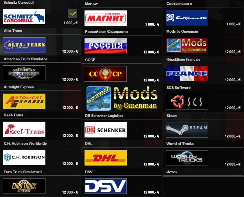 Mod of skins for the trucks Scania S, Scania R and trailer ownership. In the package 20 skins: – Alta-Trans – American Truck Simulator – Autolight Express – Beef-Trans – C.H. Robinson Worldwide – DB Schenker Logistics – DHL – DSV – Euro Truck Simulator 2 – France – Mods by Omenman – Schmitz Cargobull – SCS Software – Steam – World of Trucks – Istok – Magnit – Russia – Sovtransauto – USSR Changes in version Added 3 skins: – Schmitz Cargobull – Magnit – Sovtransauto For version 1.32 Authors: SCS, Omenman Godspeed! Credits: Omenman |
