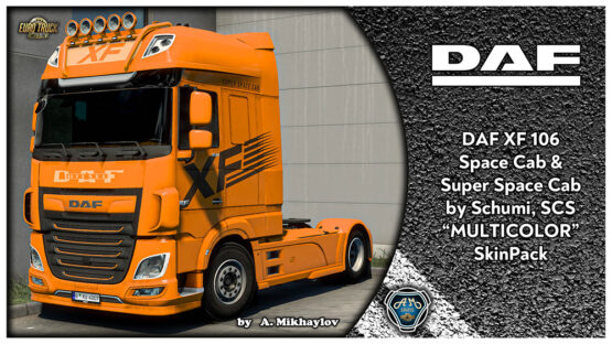 DAF XF 106 MULTICOLOR SkinPack includes skins for: 1. DAF XF Euro 6 Super Space Cab by Schumi, SCS 2. DAF XF Euro 6 Space Aero Cab by Schumi, SCS Credits: A.Mikhaylov |