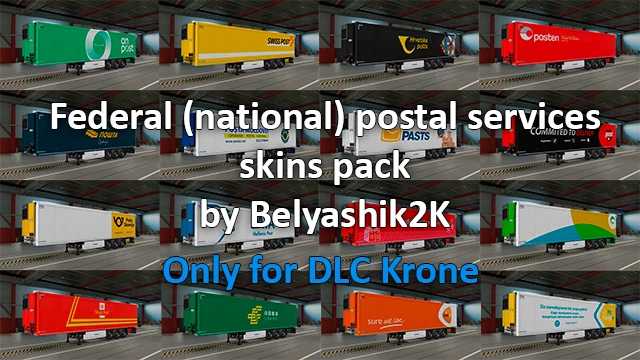 Trailers pack of federal postal services. Adds 47 new skins available for purchase (Spain, Germany, France, Italy and etc.) Each trailer was carefully designed based on photos of real trailers, but the design of some was created by me due to lack of information or converted from small mail vans. Credits Belyashik2K Credits: Belyashik2K |